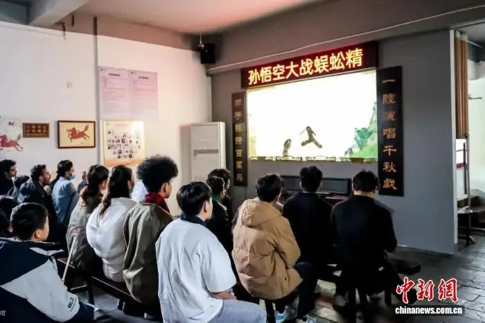 国际学生观看皮影戏《西游记》“孙悟空大战蜈蚣精”片段。 陈海旺 摄