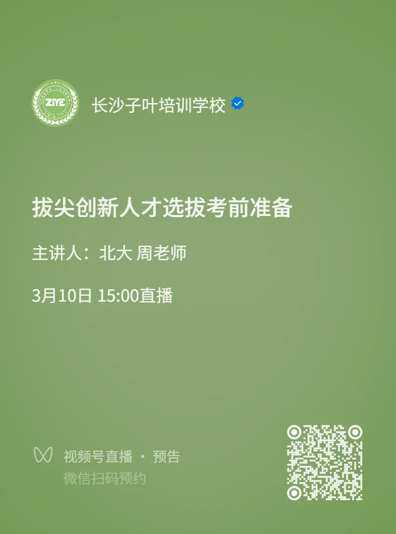 为助力考生高效备战,我们特别安排了一场线上直播讲座,时间为3月10日下午15:00,主题为“拔尖创新人才选拔考前准备”,由北大周老师主讲。欢迎扫码预约,锁定席位。