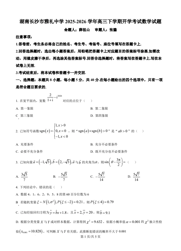 【最新试卷】湖南长沙雅礼中学2026届高三(下)开学考数学试题