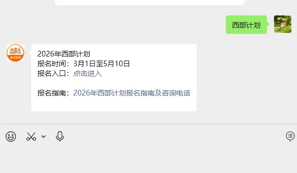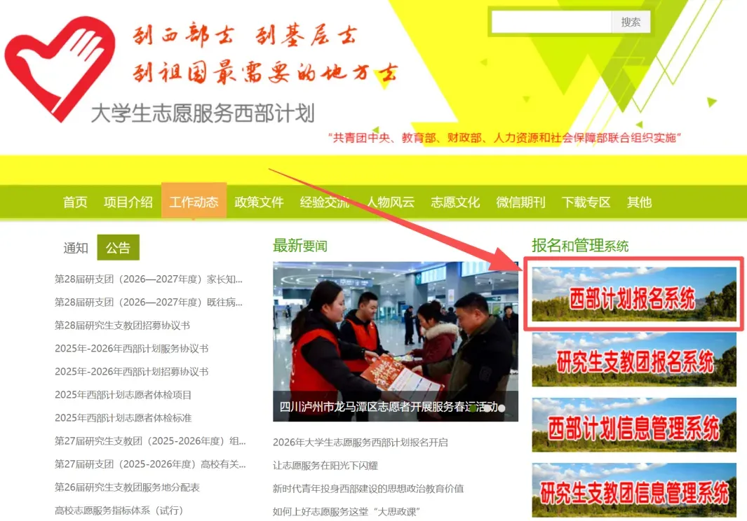 3月1日至5月10日,2026年普通高等学校应届毕业生或在读研究生, 可登录西部计划官方网站(https://xibu.youth.cn)或通过“西部志愿汇”微信公众号 (菜单栏中的“我要报名”),在西部计划信息系统(https://west.youth.cn/login)中完成注册报名。
