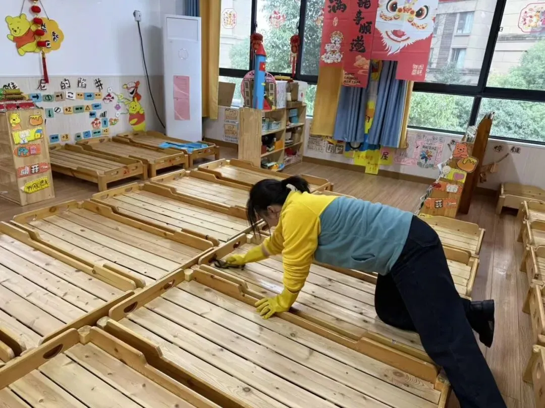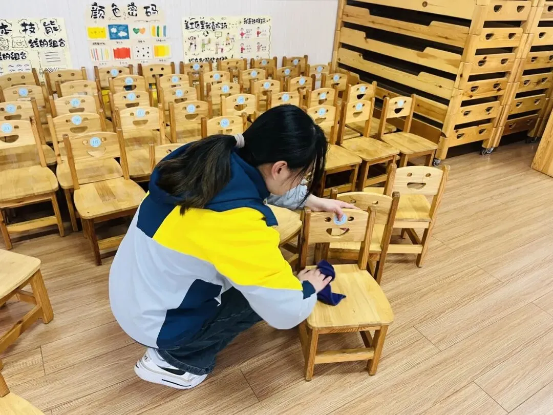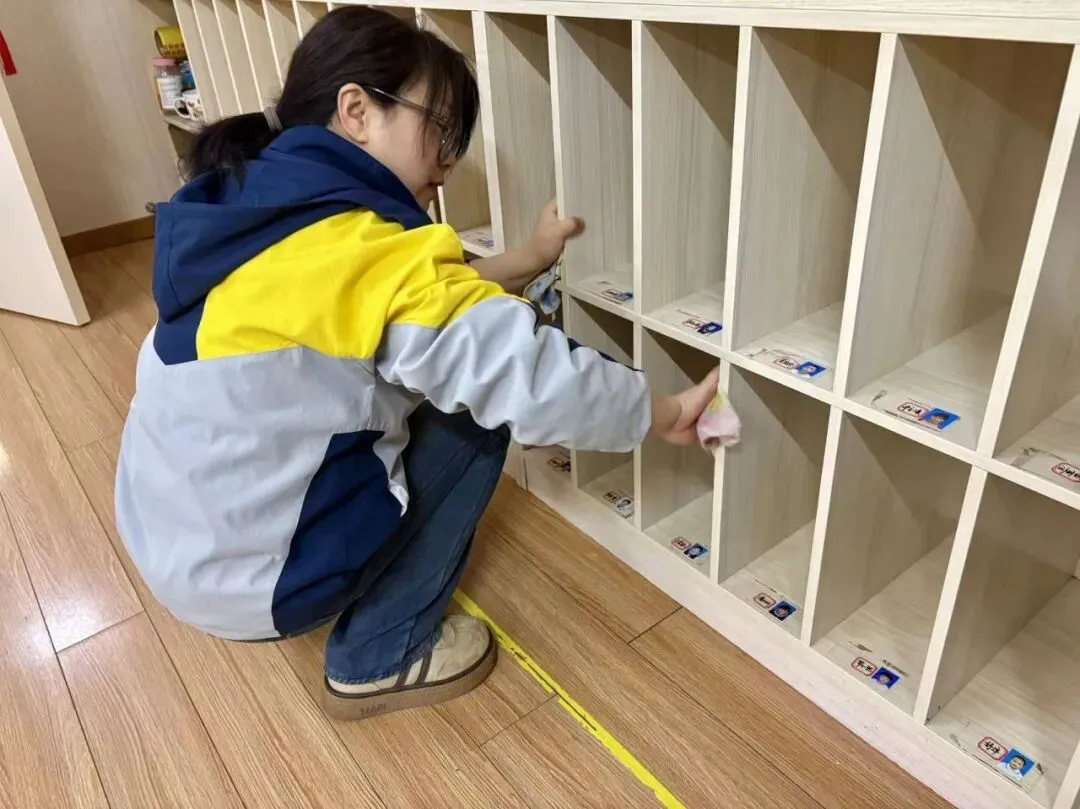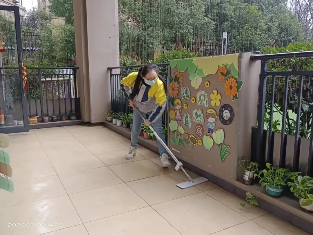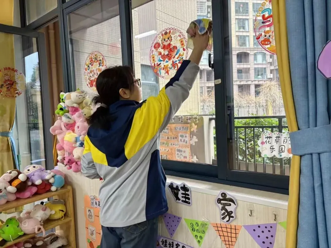 全体老师齐动手,拖洗地面、擦抹窗台、除灰尘、去污渍,不放过任何一处地方,老师尽心尽责,让各个教室、公共区域、操场以及整个幼儿园焕然一新。