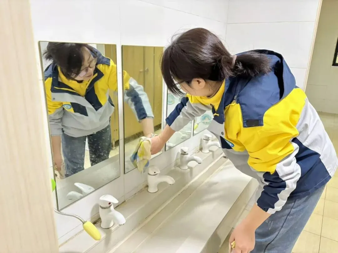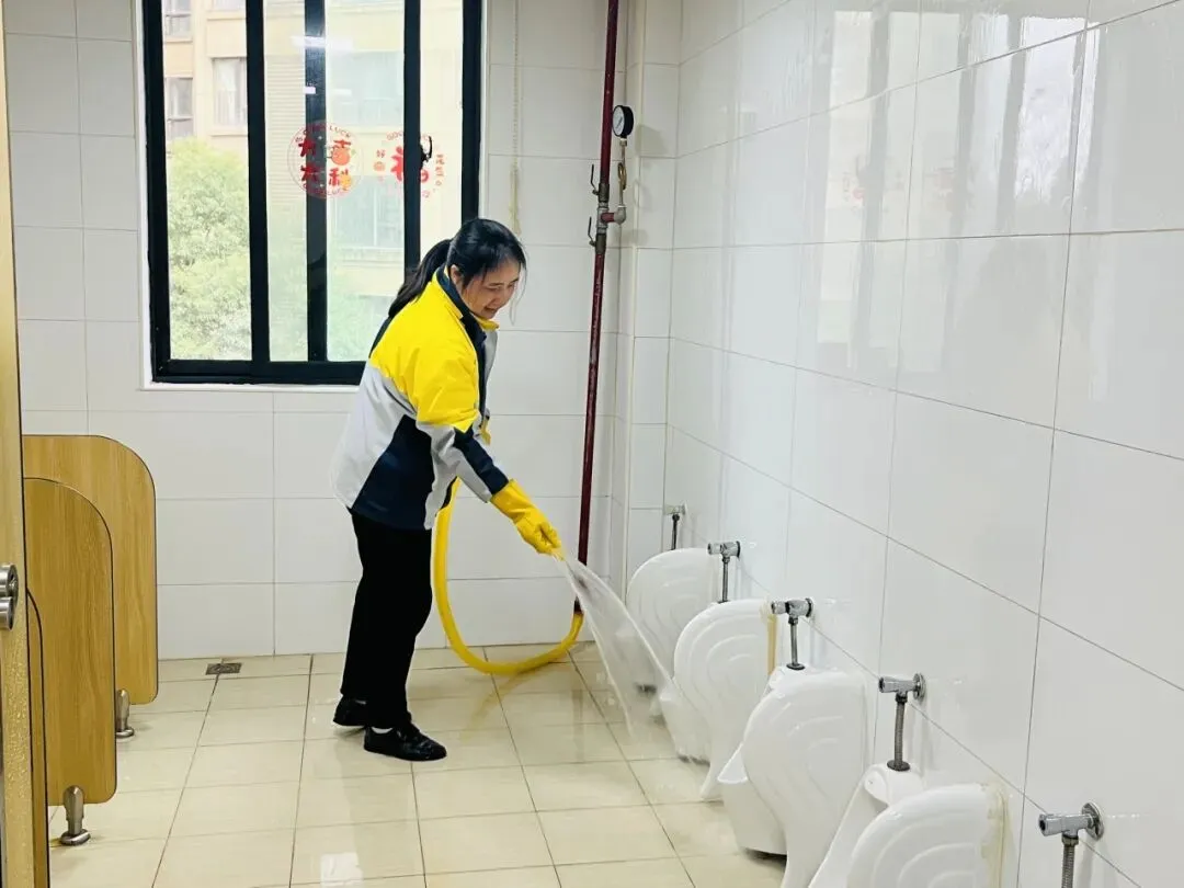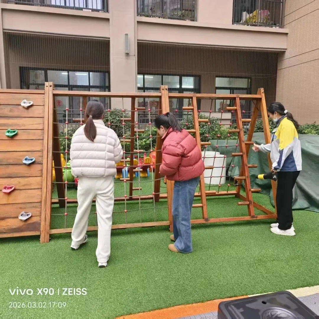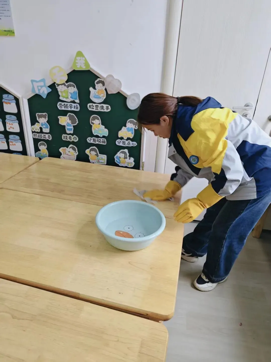 全体老师齐动手,拖洗地面、擦抹窗台、除灰尘、去污渍,不放过任何一处地方,老师尽心尽责,让各个教室、公共区域、操场以及整个幼儿园焕然一新。
