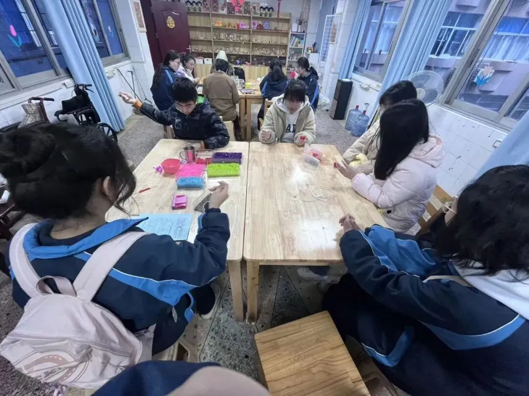 随后,同学们走进残障人士活动室,与他们一对一结对,共同制作手工艺品。穿针引线、拼接组装,大家耐心协作,在互动中传递温暖与尊重。现场氛围融洽,笑声不断。
