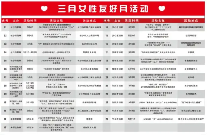 阳春三月,万物复苏。在长沙,这个三月被赋予了特殊的温度——女性友好月。为持续推进女性友好城市建设,长沙市妇联联动各区县(市)妇联、各相关单位,精心策划了40余场主题活动,涵盖思想引领、就业创业、维权关爱、健康生活、家庭文明等多个领域,诚邀广大女性朋友共赴这场春日之约。