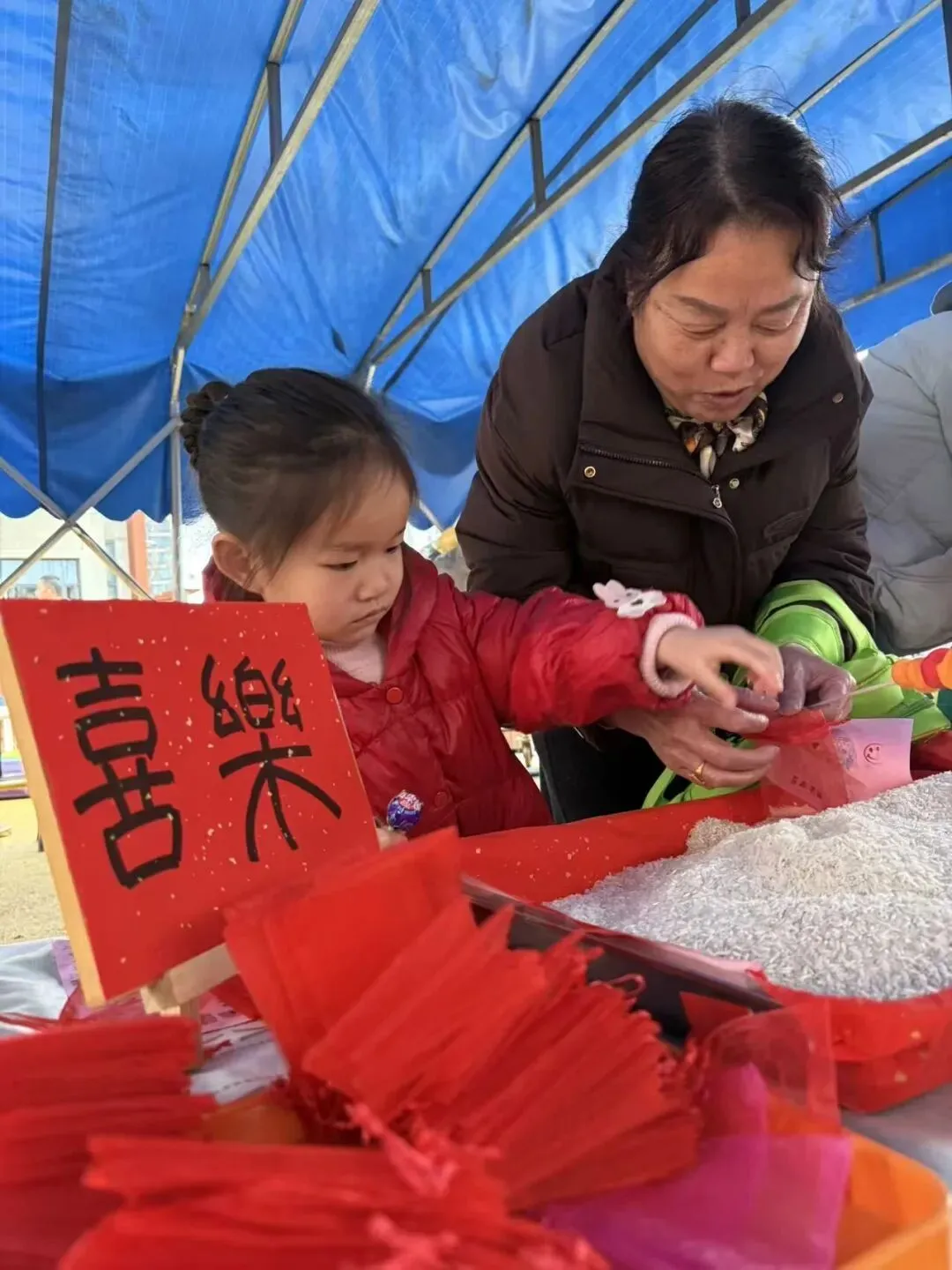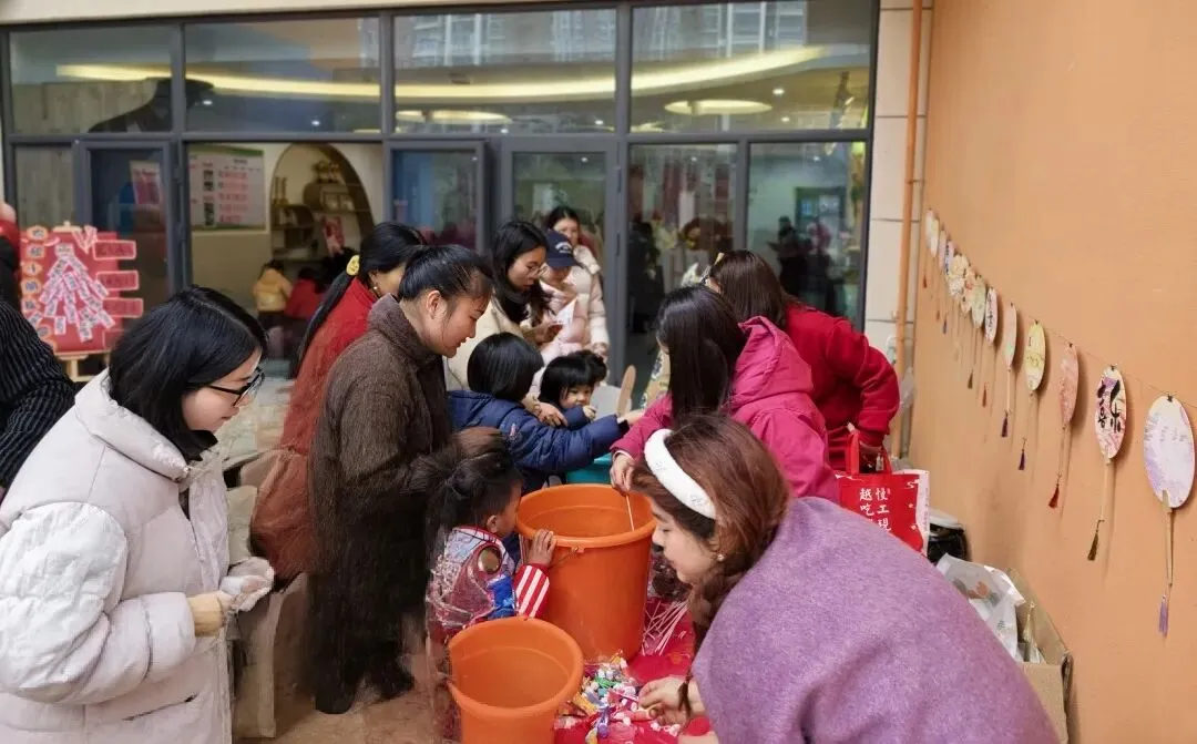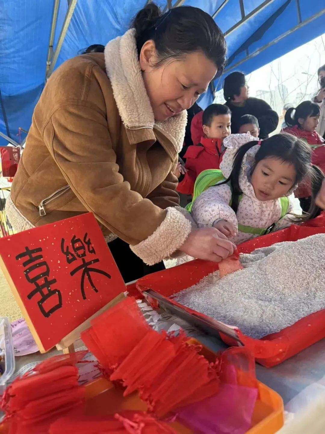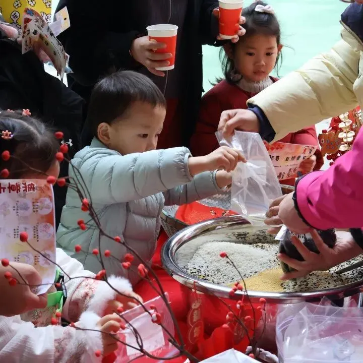 早上,家长们带着孩子将自家带来的一小袋米汇聚在一起,汇成“百家米”。这不仅是物质上的汇集,更是祝福的传递。每一粒米,都承载着一个家庭的温暖与期许,最终化作孩子们带回家的“福气米”,寓意着百家共育、福气满满。