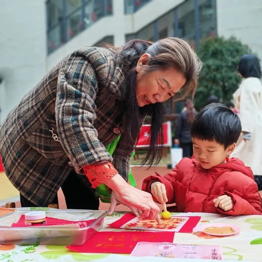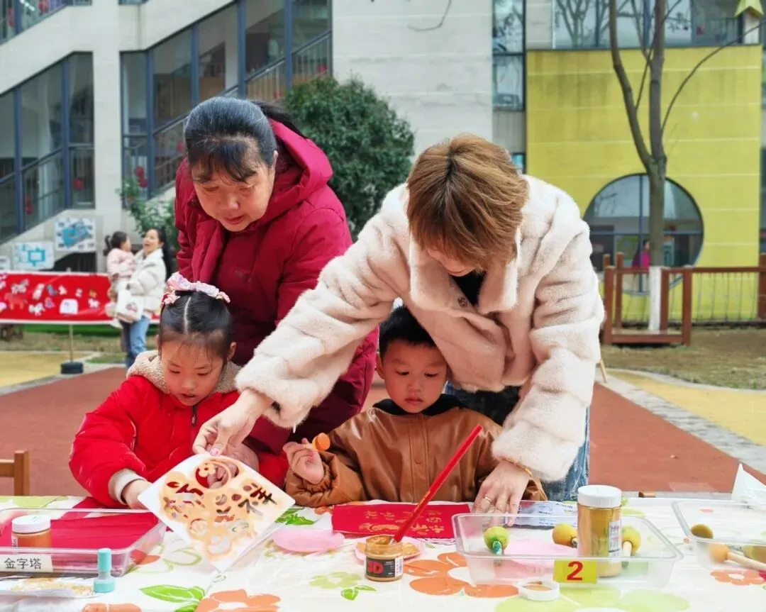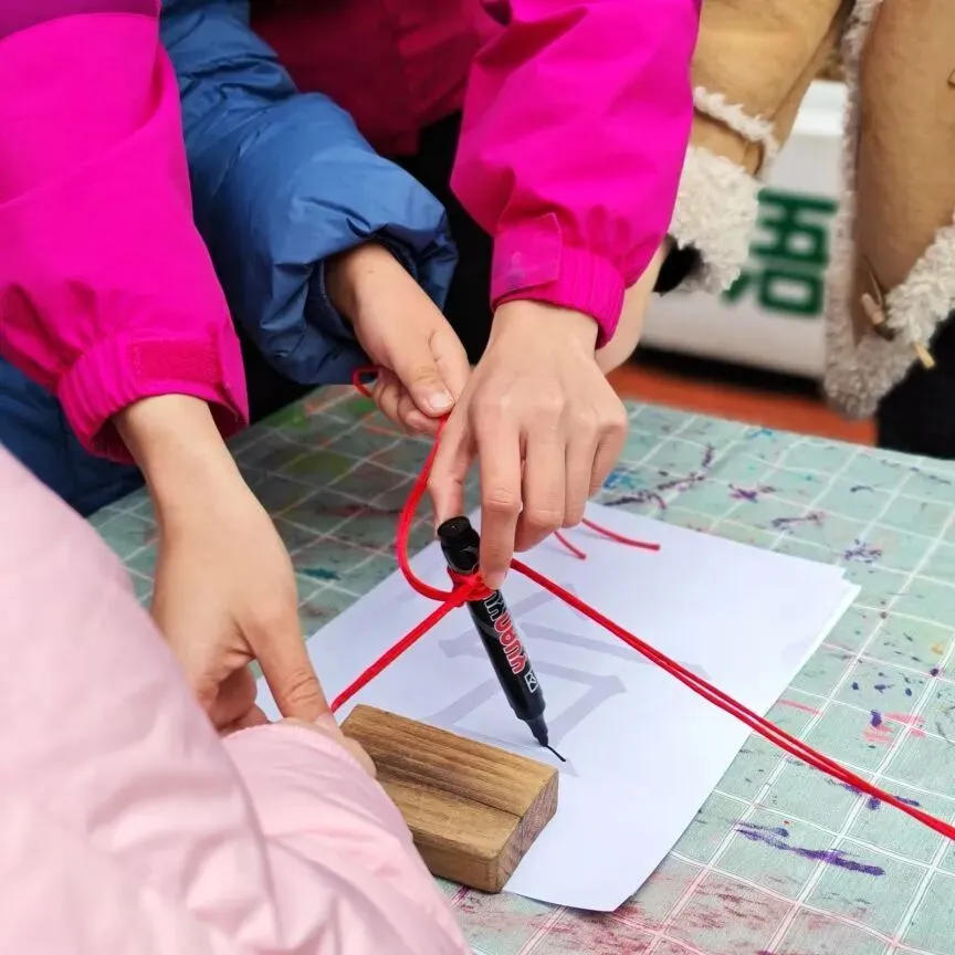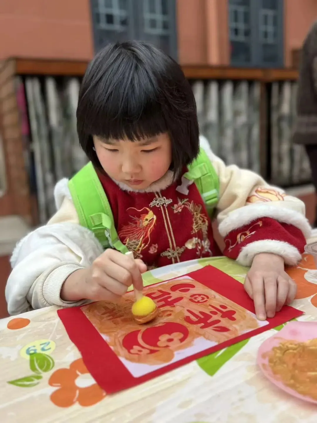 孩子们用海绵拓印棒为福字上色,认真专注的模样,让人忍不住点赞。