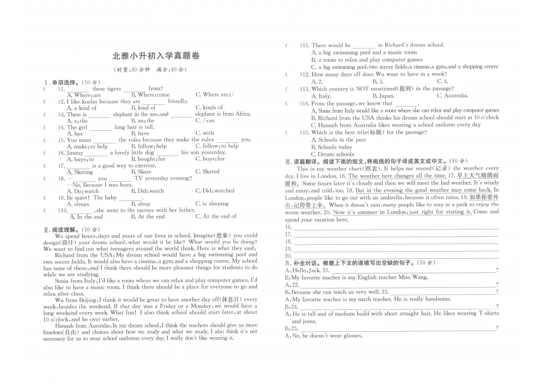 本试卷构建了‘语言知识-阅读理解-翻译转换-交际运用’四位一体的考查体系。单项选择侧重基础语法与句型运用,阅读理解考查信息获取与细节理解,语篇翻译考查中英双语转换能力,补全对话聚焦日常交际用语。得分点集中在基础语法规则和简单信息匹配;难点在于不规则动词的准确应用、特定句型的语境判断、文化背景理解(如伦敦天气)及在真实对话中补全符合逻辑的句子,需要学生具备扎实的语言基础和综合运用能力。试卷整体符合小升初选拔要求,区分度良好。