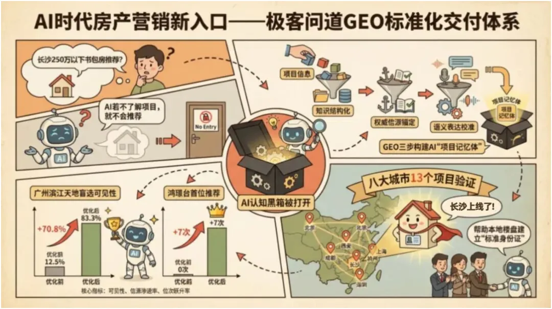 当AI成为新的流量入口,房产营销的竞争已悄然前置。极客问道GEO通过八城十三盘的实战验证,提供了将项目价值系统化植入AI认知的工程化解决方案。如今,这一能力已正式登陆长沙,正在为湘江两岸的楼盘在AI时代构建不可替代的认知护城河。