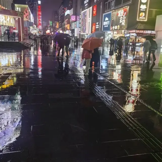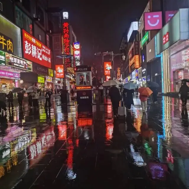 吃完饭出来,外面下着小雨,我们撑着伞开始漫步长沙街头。这里正好是黄兴路步行街 ,尽管下着雨,人依然很多。