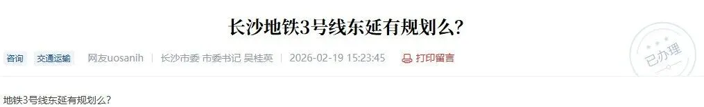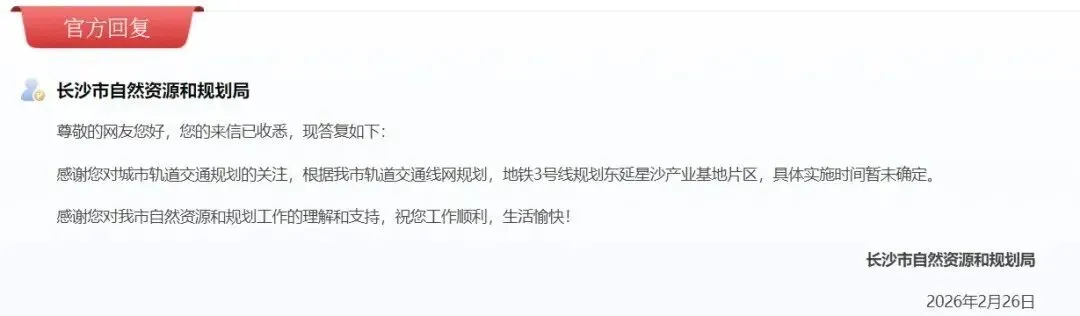 对此,长沙市自然资源和规划局于2月26日回复:根据我市轨道交通线网规划,地铁3号线规划东延星沙产业基地片区,具体实施时间暂未确定。