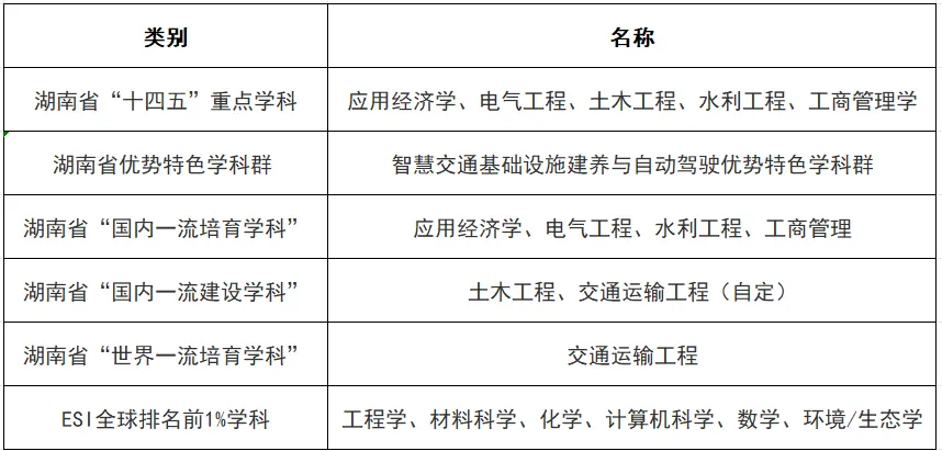 学校拥有湖南省“世界一流培育学科”“十四五”重点学科等6个、优势特色学科群1个,8个学科进入ESI全球排名前1%。有博士后科研流动站5个,一级学科博士学位授权点13个,博士专业学位授权点3个,一级学科硕士学位授权点30个,硕士专业学位授权点22个 。