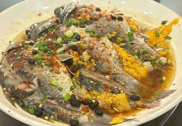蒸鲫鱼每桌都点是有道理的!鱼蒸得嫩,鲜味十足。尤其要夸的是鱼籽,浸在汤汁里,又鲜又糯,拌饭简直绝了。