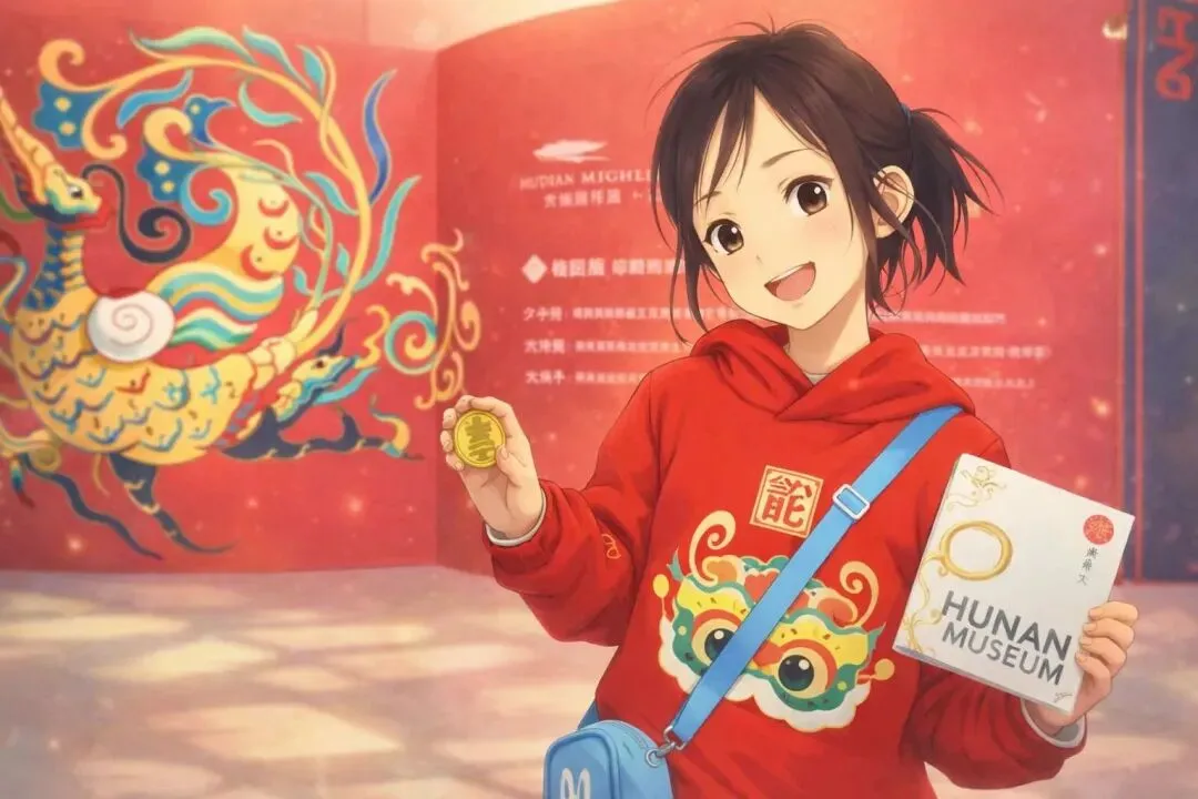 临走出博物院之前,爸爸学着在故宫博物院的做法,给妹妹也带了一个纪念金色币,希望在妹妹心中埋下一颗学习传统文化的种子,坚持文化自信,弘扬优秀传统,创造更美好的生活。