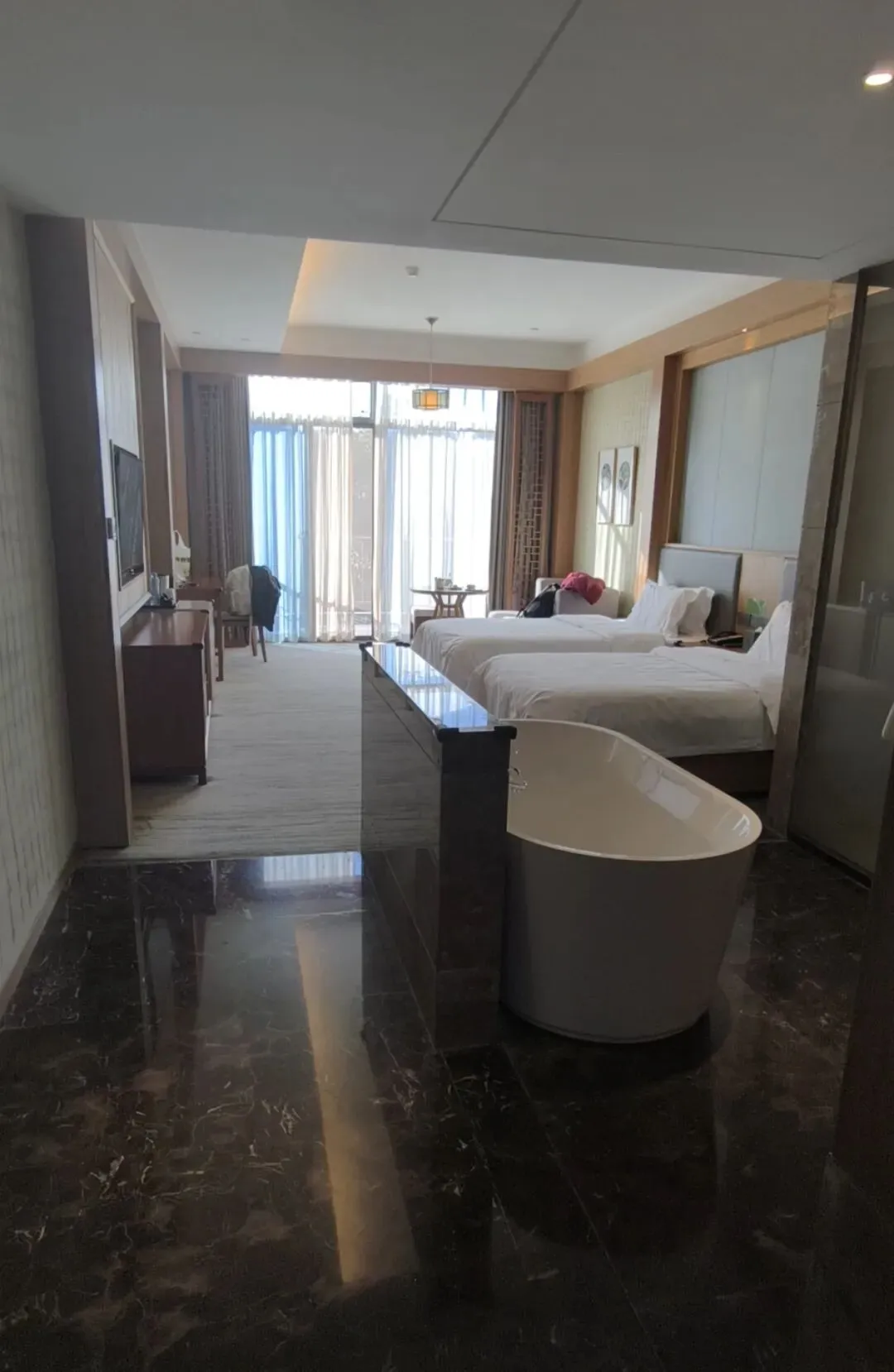 酒店的客房宽大明亮,五星级标准配置,推窗即景,阳台外或是远山如黛,或是园林葱茏。有游客评价:“房间大、床品舒适、干湿分离,带阳台的房型尤其惬意