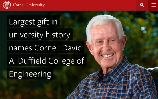 2026年1月22日,康奈尔大学宣布收到校史最大单笔捐赠:校友戴维·达菲尔德(David A. Duffield)以累计5.5亿美元的捐款,将工程学院正式更名为“康奈尔戴维·达菲尔德工程学院”(Cornell David A. Duffield College of Engineering)。这笔巨款中,3.715亿美元为新增承诺,加上2025年的1亿美元及过往捐赠,构成了足以影响几代人的学术投资。