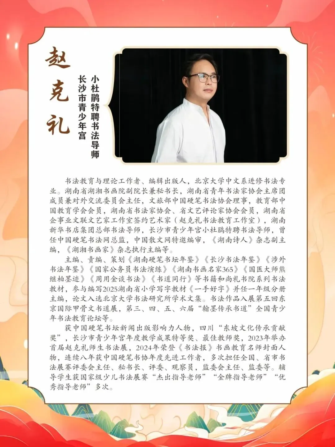 10月,被连聘为第十六届湖南省少儿才艺大赛(团省委、省少工委、省文联等)全省总决赛书法评委;