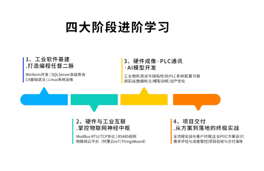 ✔ 4阶段全链路培养:工业软件→硬件联调→AI模型→项目交付,完整掌握智能制造全流程技能,毕业就能上手企业项目。