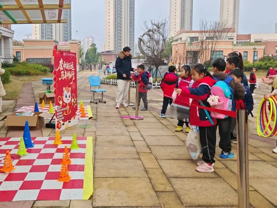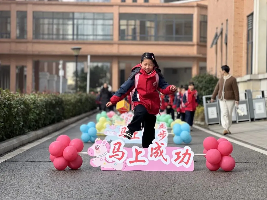 一座寓意深刻的 “跃马龙门”互动体验格外引人注目——这里设置了一排装饰精美的小跨栏,每一道栏板上都写着“一马当先”“马到成功”“龙马精神”等饱含祝福的马年成语。同学们排着整齐的队伍,依次助跑、起跳,奋力跨越这一道道写满期许的“龙门”。这不仅是一次简单的趣味活动,更象征着在新学期里克服困难、超越自我,以“一马当先”的勇气去追寻更广阔的天空。