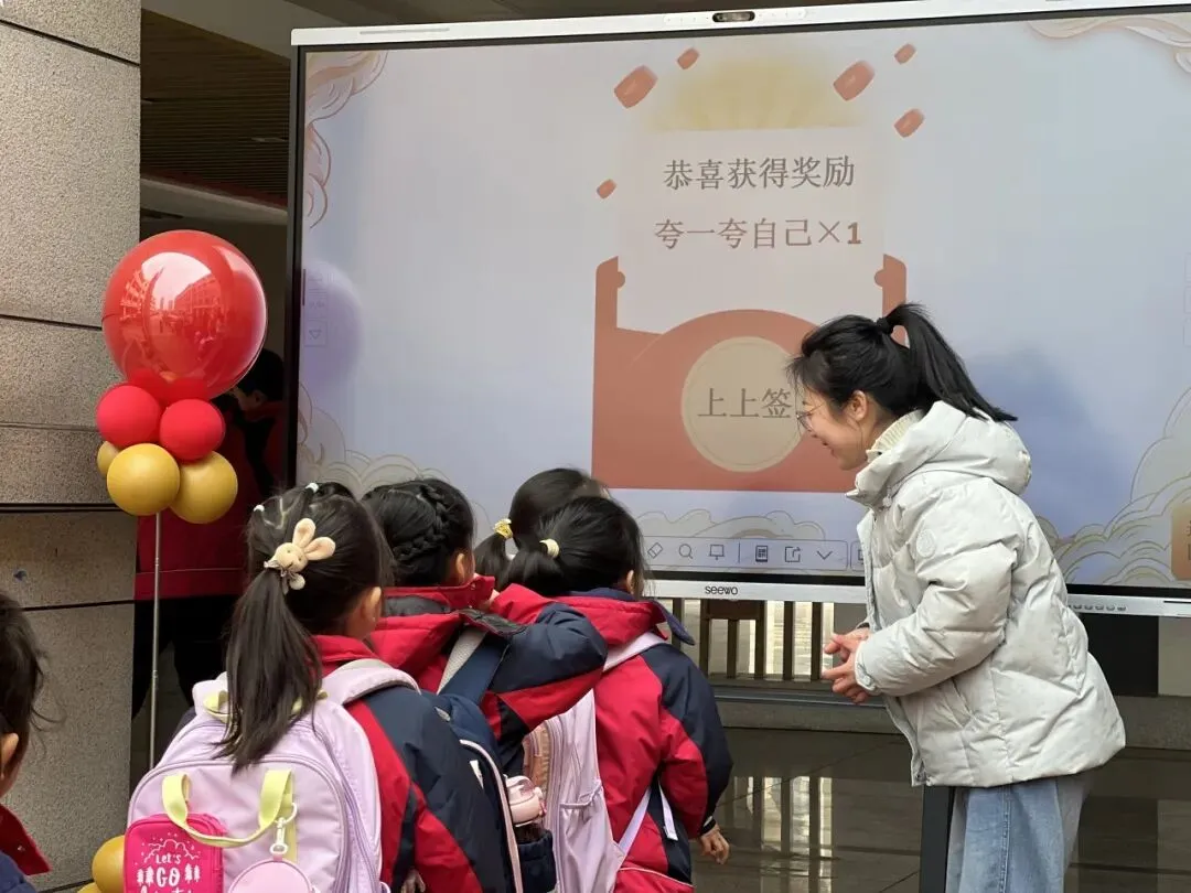 最受同学们期待的当属 “趣味纳吉”与“惊喜开运” 区域。在 “趣味纳吉” 环节,同学们屏息凝神,瞄准目标,轻轻一掷——套中的瞬间,欢呼声与掌声此起彼伏。这项充满传统民俗特色的套圈游戏,不仅考验着手眼协调,更寄托着“套住好运”“纳吉纳福”的美好寓意。而随后的 “惊喜开运” 则充满了科技感——学校利用智能屏幕设计了电子抽福袋互动,同学们轻点屏幕,一个个满载祝福的“幸运福袋”便跃然而出。福袋里装着励志书签、种子卡片、心愿贴纸等小礼物,寓意着“一马当先”“马到成功”的美好期许。在传统游戏与现代科技的交替体验中,同学们收获了新学期的第一份“好运”,也在惊喜与期待中开启了全新的学习旅程。