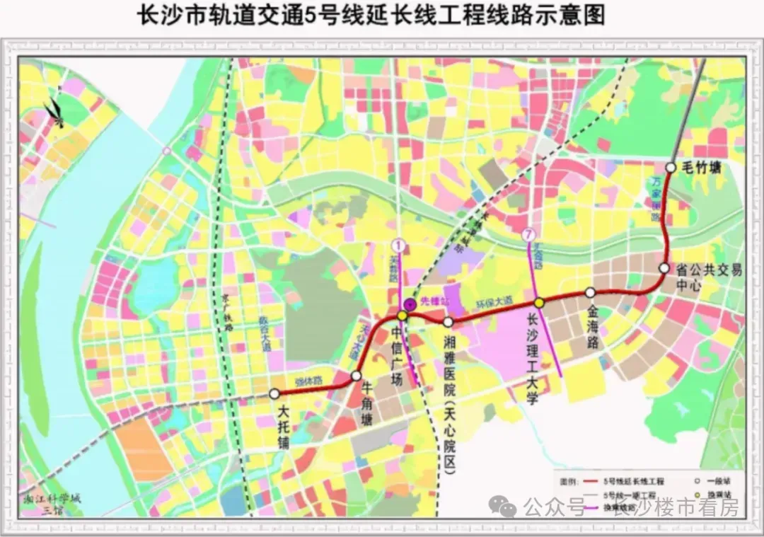 长沙地铁5号线南延段串联天心区南部、暮云片区与主城区,加速长株潭一体化进程,支撑长沙南拓战略落地;作为2029年第十六届全运会重点交通配套工程,将有效缓解赛事期间南部片区交通压力;覆盖长沙理工大学、中信广场等人口密集区与商业中心。