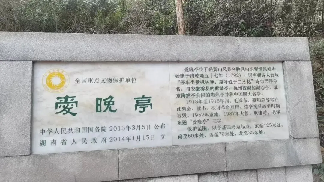 最先到的是爱晚亭。这座亭子原名红叶亭,清乾隆五十七年(1792年)由岳麓书院山长罗典修建。后来湖广总督毕沅觉得这名字不够雅致,便取了杜牧“停车坐爱枫林晚,霜叶红于二月花”的诗意,改名为爱晚亭。据说当年毛泽东在长沙求学时,常与蔡和森、罗学瓒、张昆弟等挚友在此聚会,研讨国家大事,探求革命真理。有时甚至在风雨交加的夜晚,独自一人来到这里历练胆量。后来,他与杨开慧相爱,也常在爱晚亭互诉钟情。