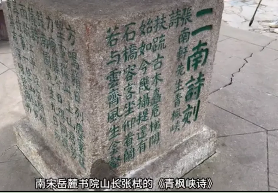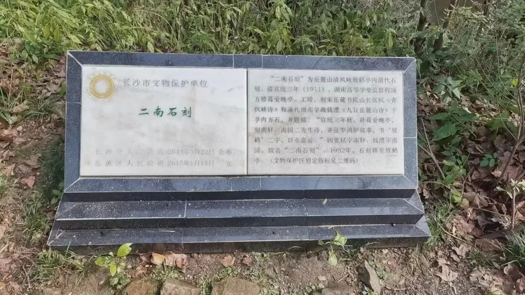 离爱晚亭不过二三十步,有一座隐蔽在绿树丛中的草亭,叫放鹤亭。这里面藏着一件容易被忽视的珍贵文物——“二南石刻”。那是1911年,湖南高等学堂学监陈颂万在修葺爱晚亭时,将一方石块置于亭中,上面镌刻着南宋岳麓书院山长张栻的《青枫峡诗》和清代湖南学政钱澧的《九日岳麓山诗》。因张栻号南轩,钱澧号南园,故得名“二南石刻”。爱晚亭在抗战时被毁,1952年重修时,便将这石刻安置在现在的放鹤亭中。