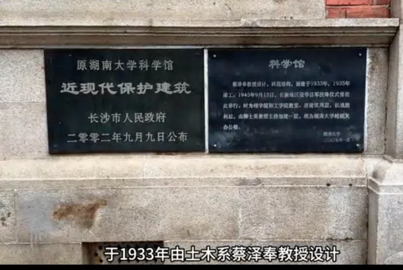 下山时,又经过湖南大学。那栋科学馆——学生们叫它红楼,是1933年由蔡泽奉教授设计的。1945年9月15日,中国陆军第四方面军在这里举行了长衡地区受降仪式,日军第二十军司令板西一良向王耀武将军呈递了降书。湖南大学因此成为中国唯一举行过抗战胜利受降仪式的大学。毛泽东主席手书“湖南大学”巨石旁边的两根艾奥尼克柱,则是1938年4月10日日军轰炸长沙的见证,那场轰炸中,湖大校区几乎被夷为平地,仅存四根门柱这是其中的两根。