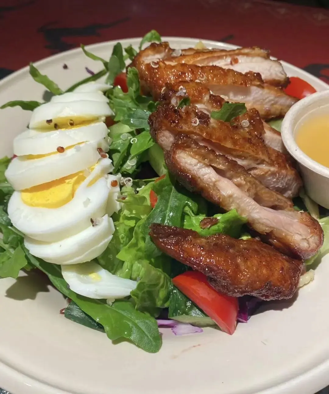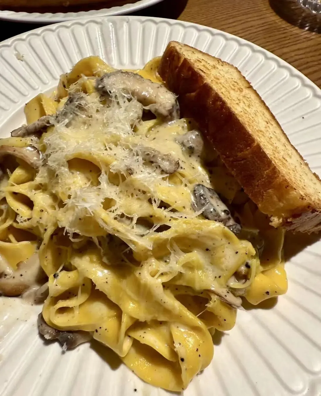 黑松露蘑菇奶油意面,宽面劲道挂汁入味,菌菇鲜香,奶味浓郁,搭配微焦酥脆的吐司片,很赞。就是吃多了有一点点子腻,分量可以,也可以点加面。