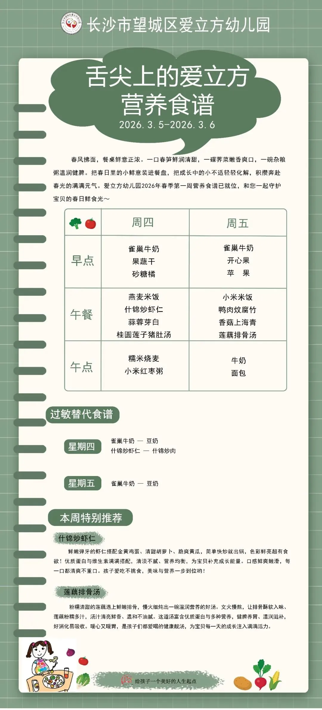 >【爱的美食•美食预告】长沙市望城区爱立方幼儿园2026年3月5日-3月6日美食预告