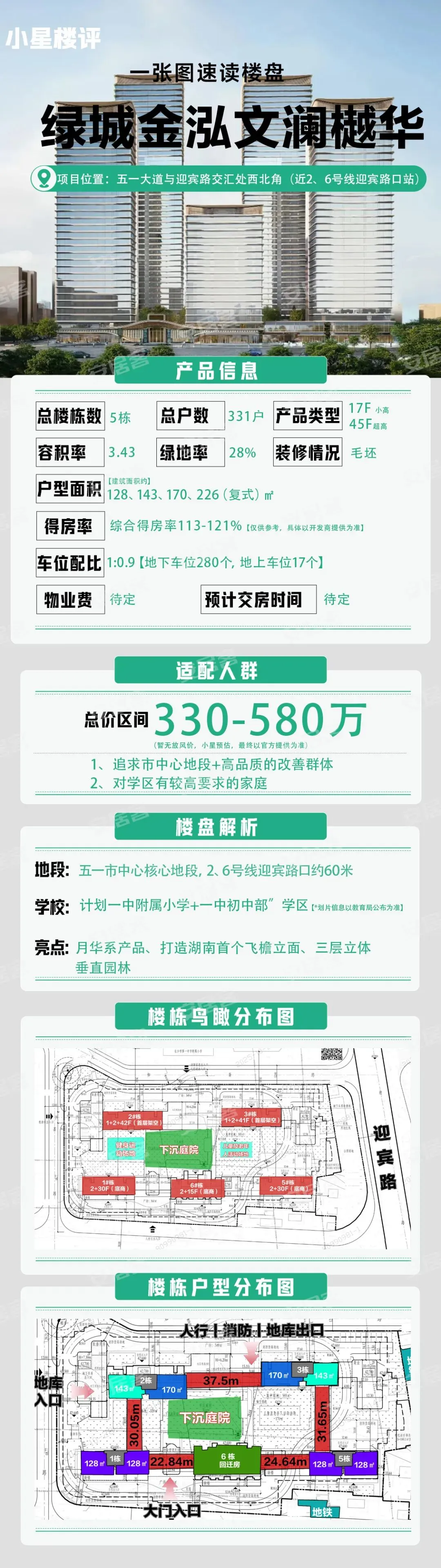 绿城金泓文澜樾华共规划5栋,共计331户,其中2栋、3栋为超高层,1栋、5栋为高层,6栋为小高层,其中值得注意的是,唯一的这栋小高层是项目拿地要求中需建设的回迁房。