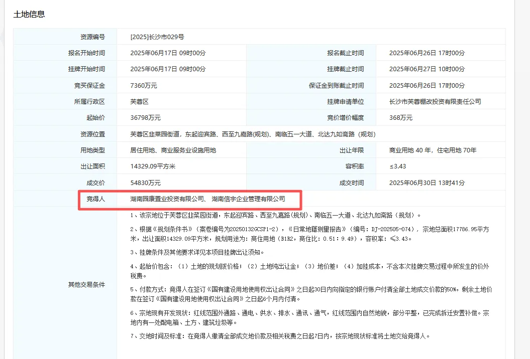 2025年6月17日,园康&信宇在经历了50轮竞价之后,以溢价率约49%联合摘得的芙蓉中心黄土塘地块,折合楼面价约11156元/㎡。