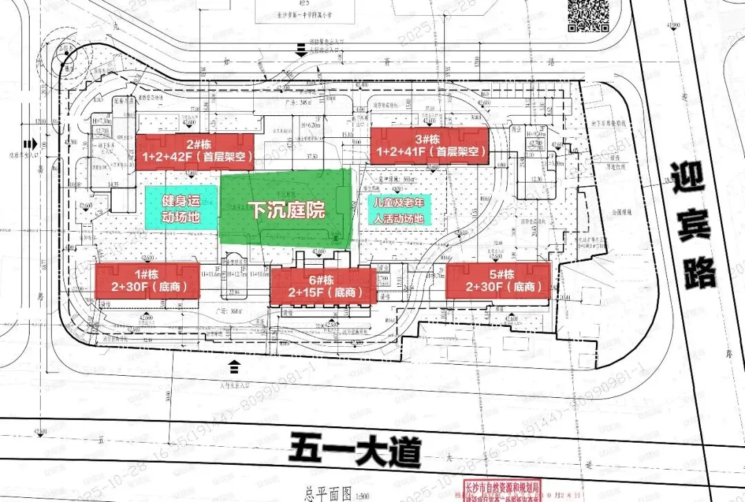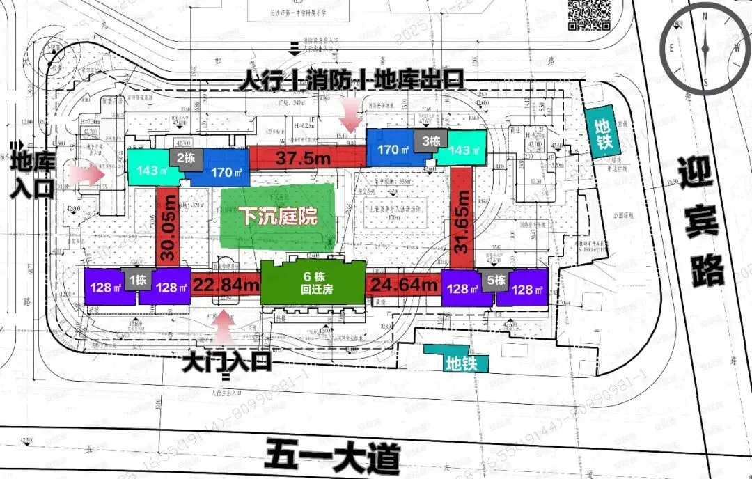 楼栋分布整体呈围合式,中间毫无疑问就是中央园林,其中1栋、6栋、5栋临五一大道,128㎡的户型就都临五一大道,大户型都在后面两栋。其中5栋和3栋更加靠近两个地铁口,入口大门设置在项目以南,而地库入口则是在项目西侧。