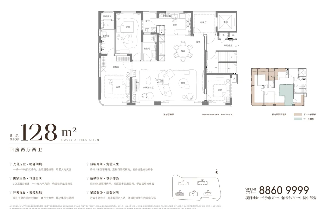 2、128㎡的户型,豪宅基因深入髓,也了解高净值人群对于品质的需求,客厅与餐厅等宽,更显空间感;