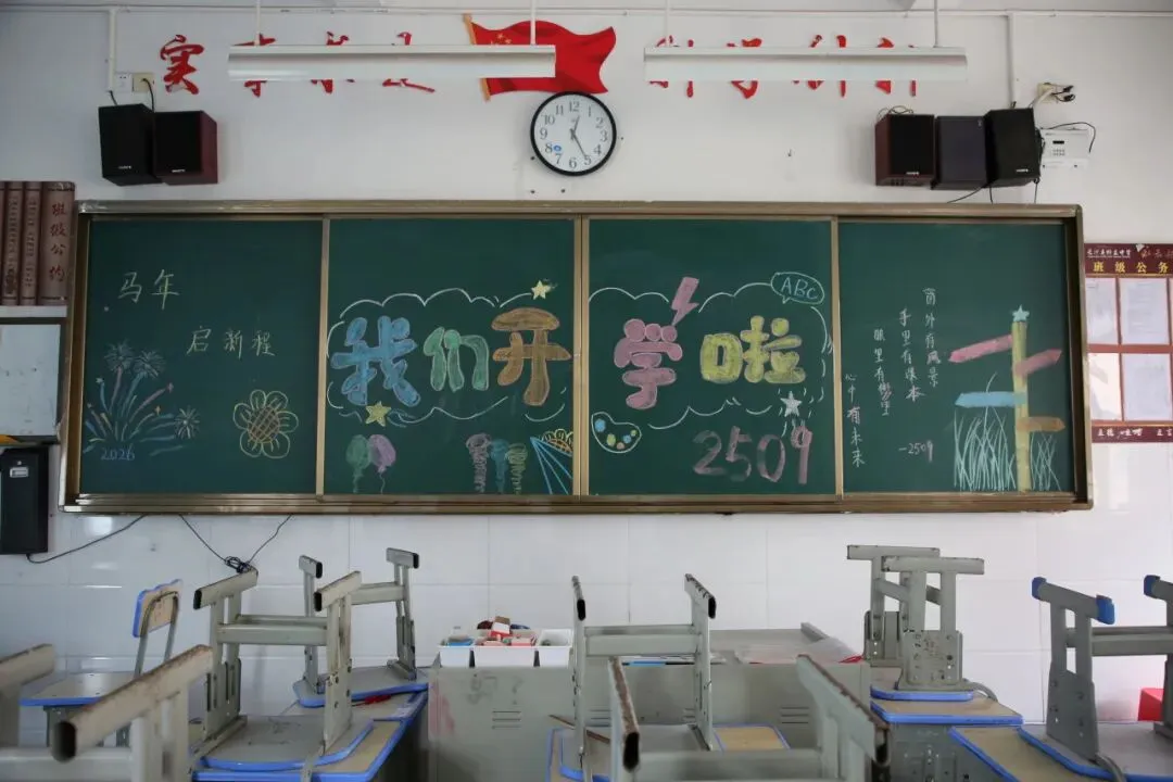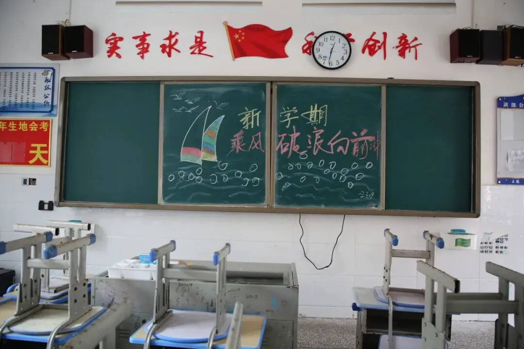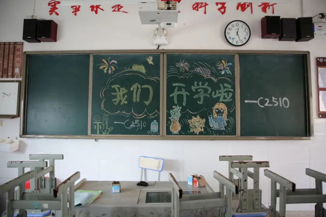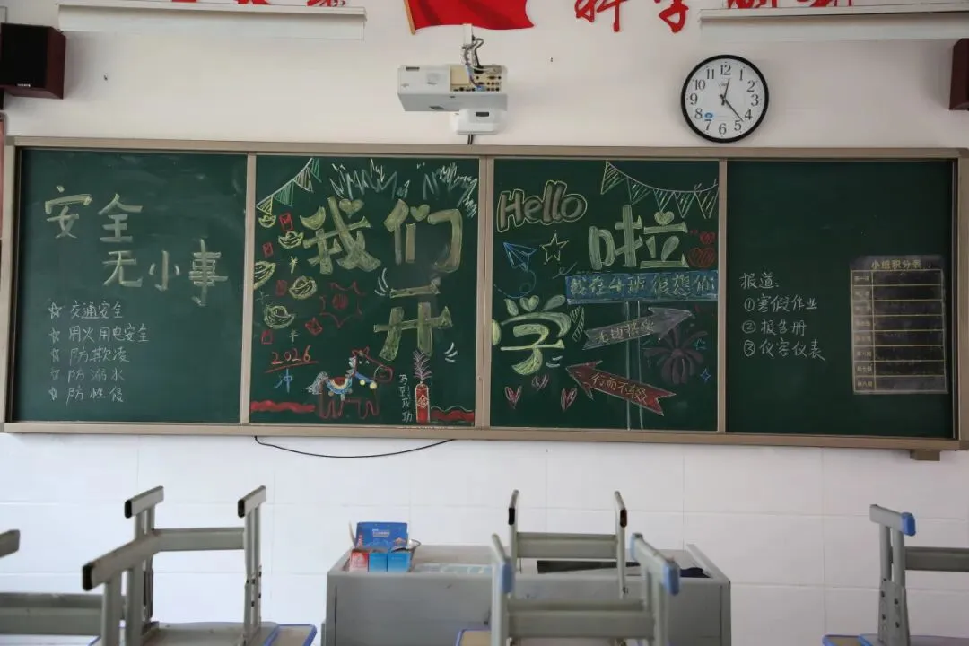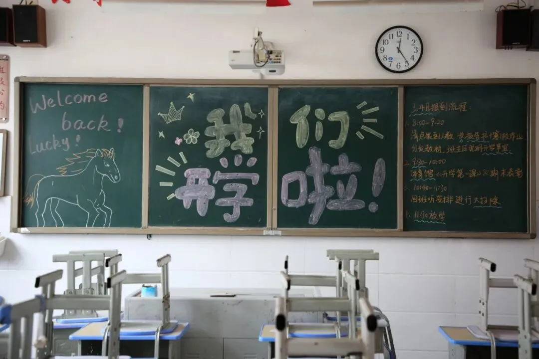 走进教室,更是一派温馨有序的景象。精心布置的黑板报色彩明亮、主题鲜明,字里行间满是对新学期的期待与祝福,让教室焕然一新、充满活力。