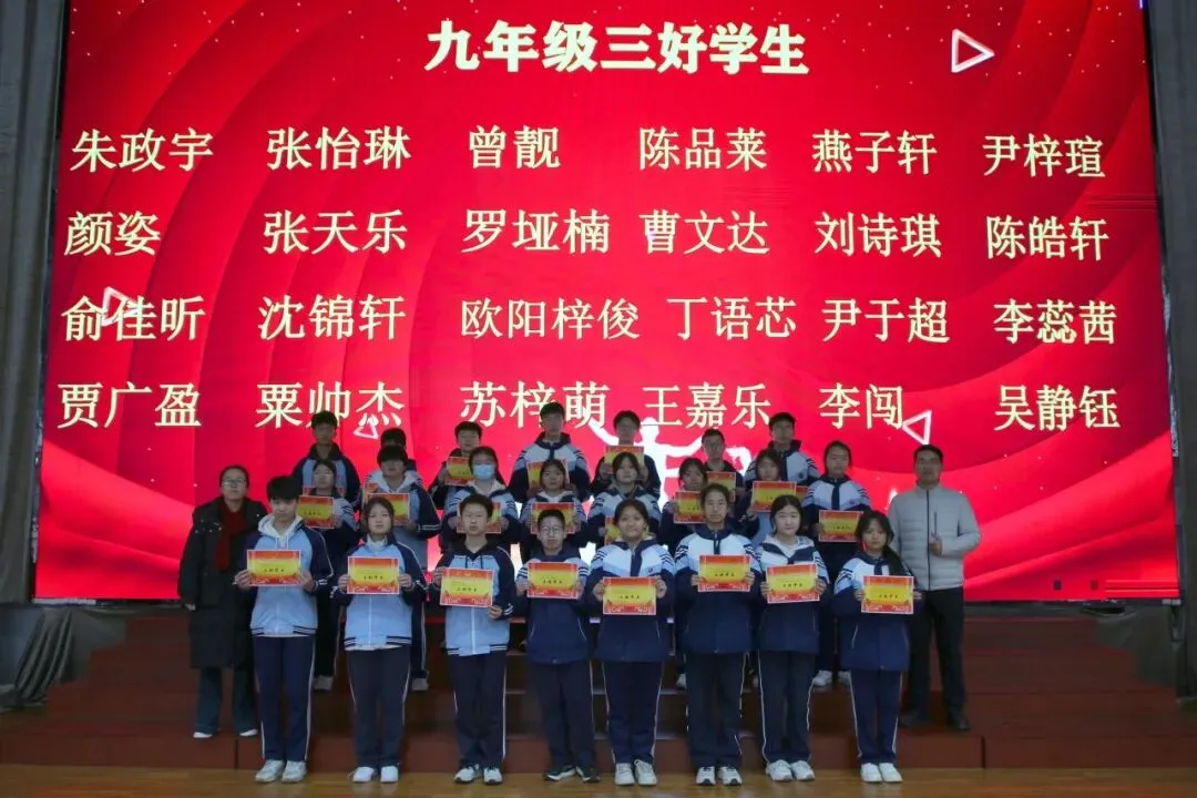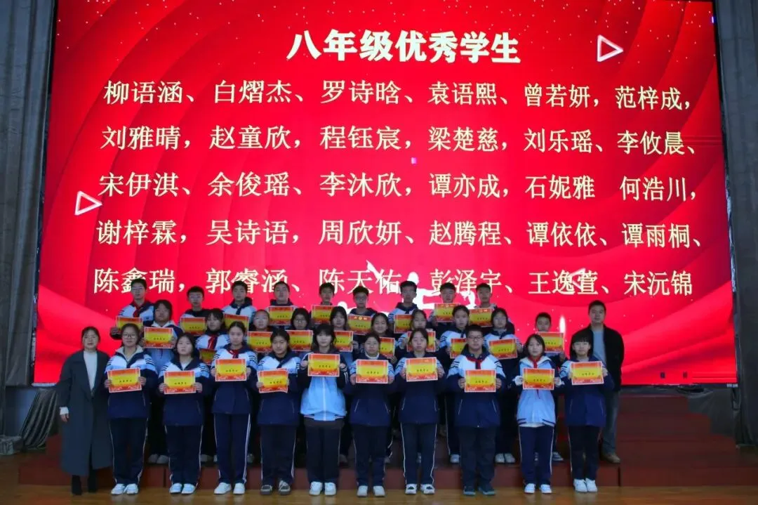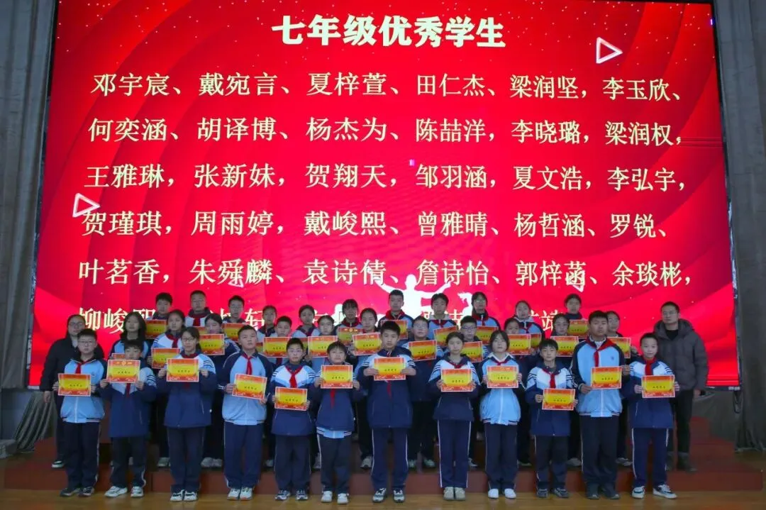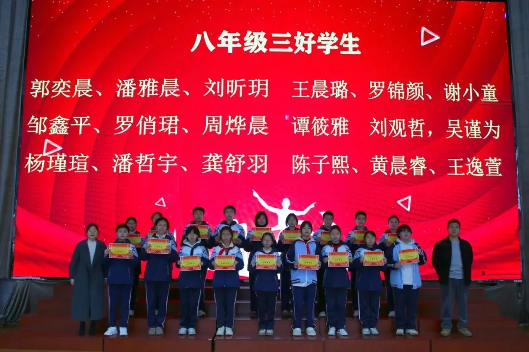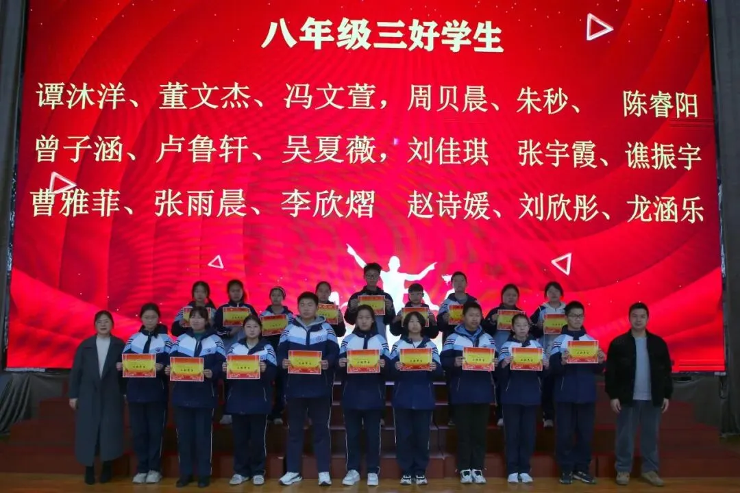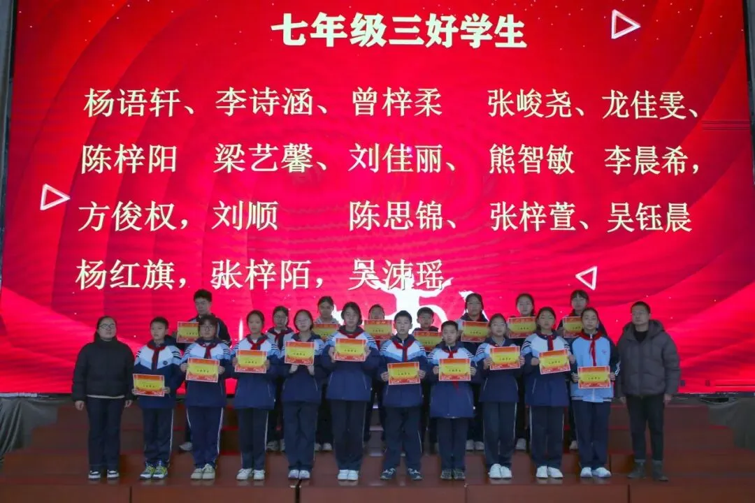 讲话尾声,学校举行了表彰仪式,对各年级涌现出的三好学生、优秀学生、优秀班干部、书香少年等先进个人进行现场表彰。学校为受表彰同学颁发荣誉证书,并合影留念,勉励他们珍惜荣誉、戒骄戒躁、再接再厉,在新学期再创佳绩。同时号召全体同学以先进为榜样,见贤思齐、严于律己、勤奋进取,在校园中营造比学赶超、文明和谐的良好氛围。