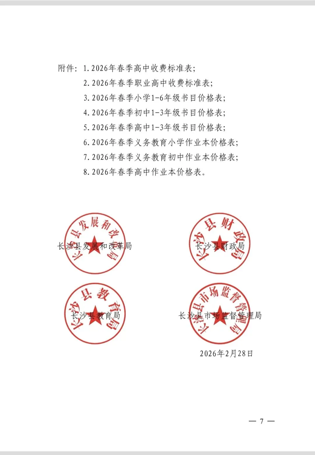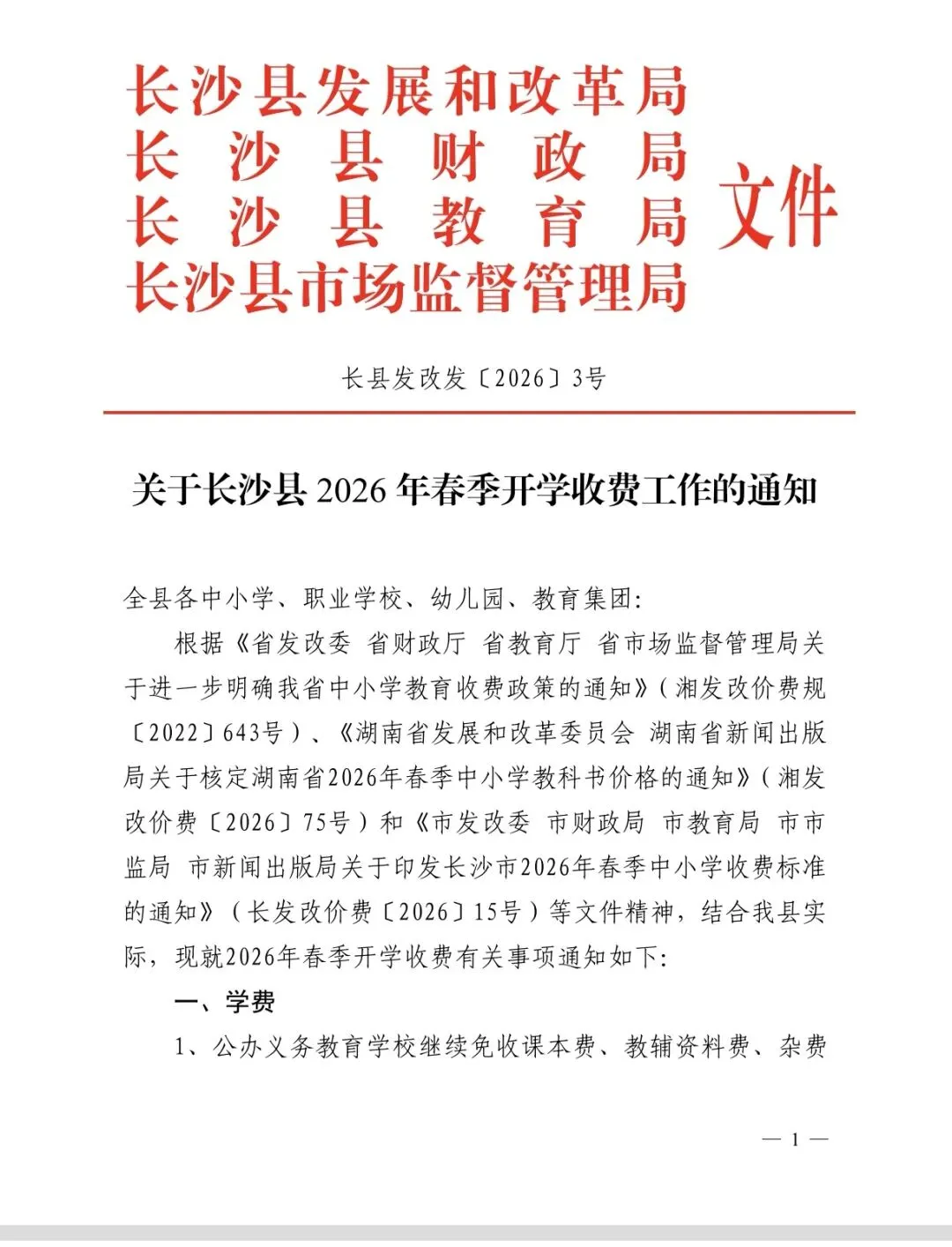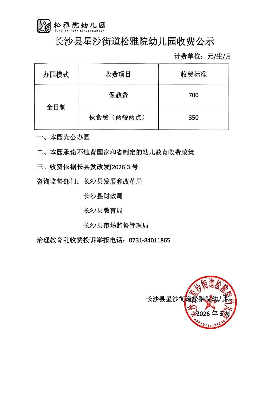 为了让家长了解我园收费标准,增加收费透明度。现转发长沙县发展和改革局、长沙县财政局、长沙县教育局、长沙县市场监督管理局《关于长沙县2026年春季开学收费工作的通知》(长县发改发[2026]3号),欢迎广大家长和社会共同监督。