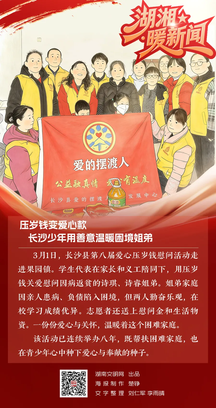 本次活动负责人田晓勤介绍,“今年是我们第八年开展爱心压岁钱活动,不仅为困难家庭带来一些物质上的帮助,更重要的是给予他们精神上的慰藉和鼓励,同时在青少年心中播下奉献、友爱、互助的种子,引导他们扣好人生的第一粒扣子。我们也将继续汇聚更多的各界爱心力量,让温暖触达长沙县每一个角落”。