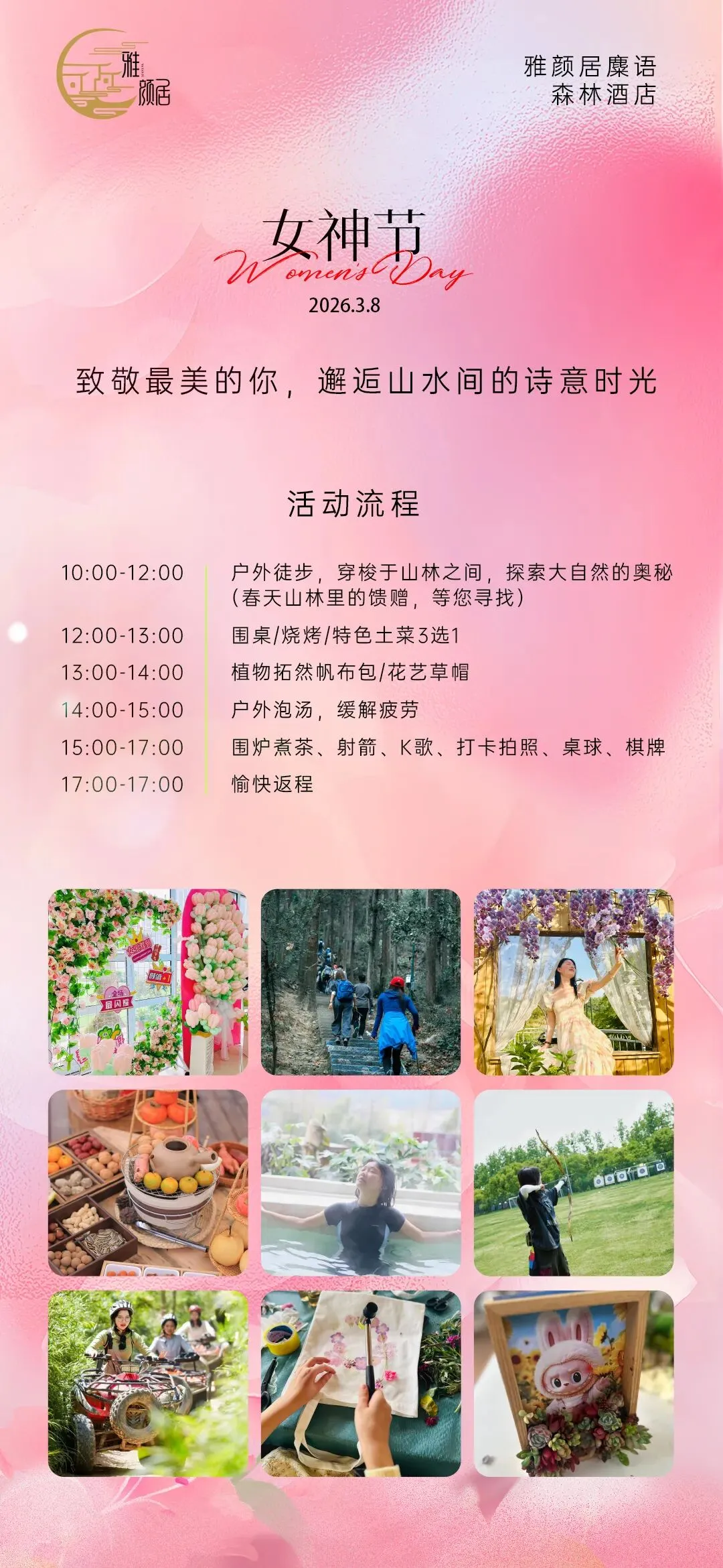 活动内容:户外野菜、射箭、温泉、本地土菜、围炉煮茶、独立聚会厅