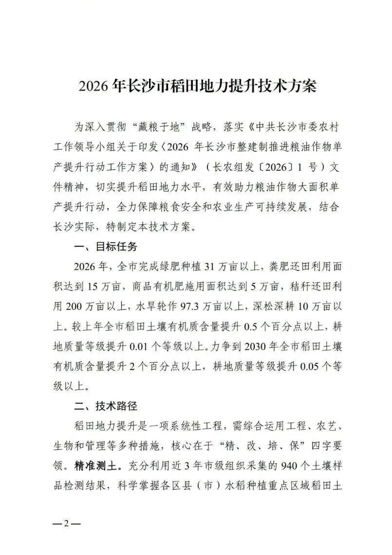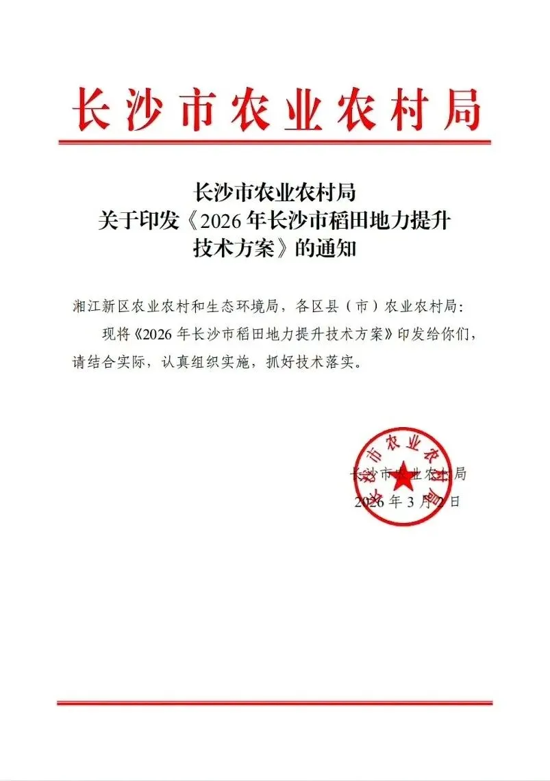 >关注 | 长沙市农业农村局关于印发《2026年长沙市稻田地力提升技术方案》的通知