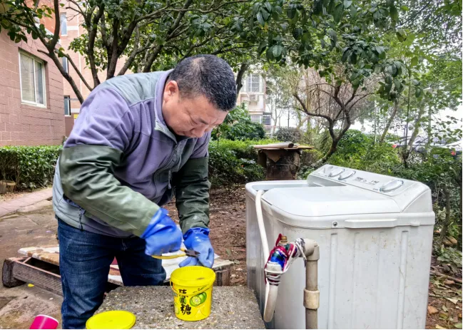 时间长了,他的双手已被磨出厚茧,非常粗糙。2025年10月,他花70元买了一台二手洗衣机,还是摆在老地方。时间久了,邻居们都将这个清洗的位置默契地留给了他。