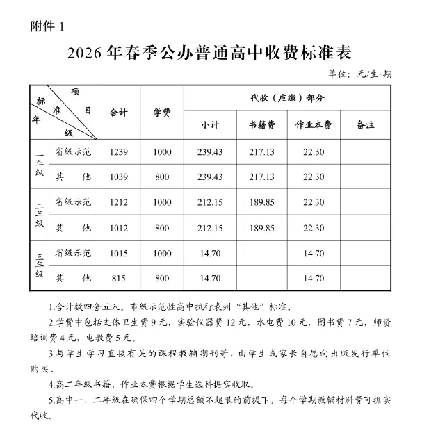 公办普通高中收费实行分类管理,学费标准分省级示范性高中、其他普通高中两个档次,公办普通高中对家庭经济困难等政策范围内学生,免收学杂费和教材费,兜住困难学生就学底线。