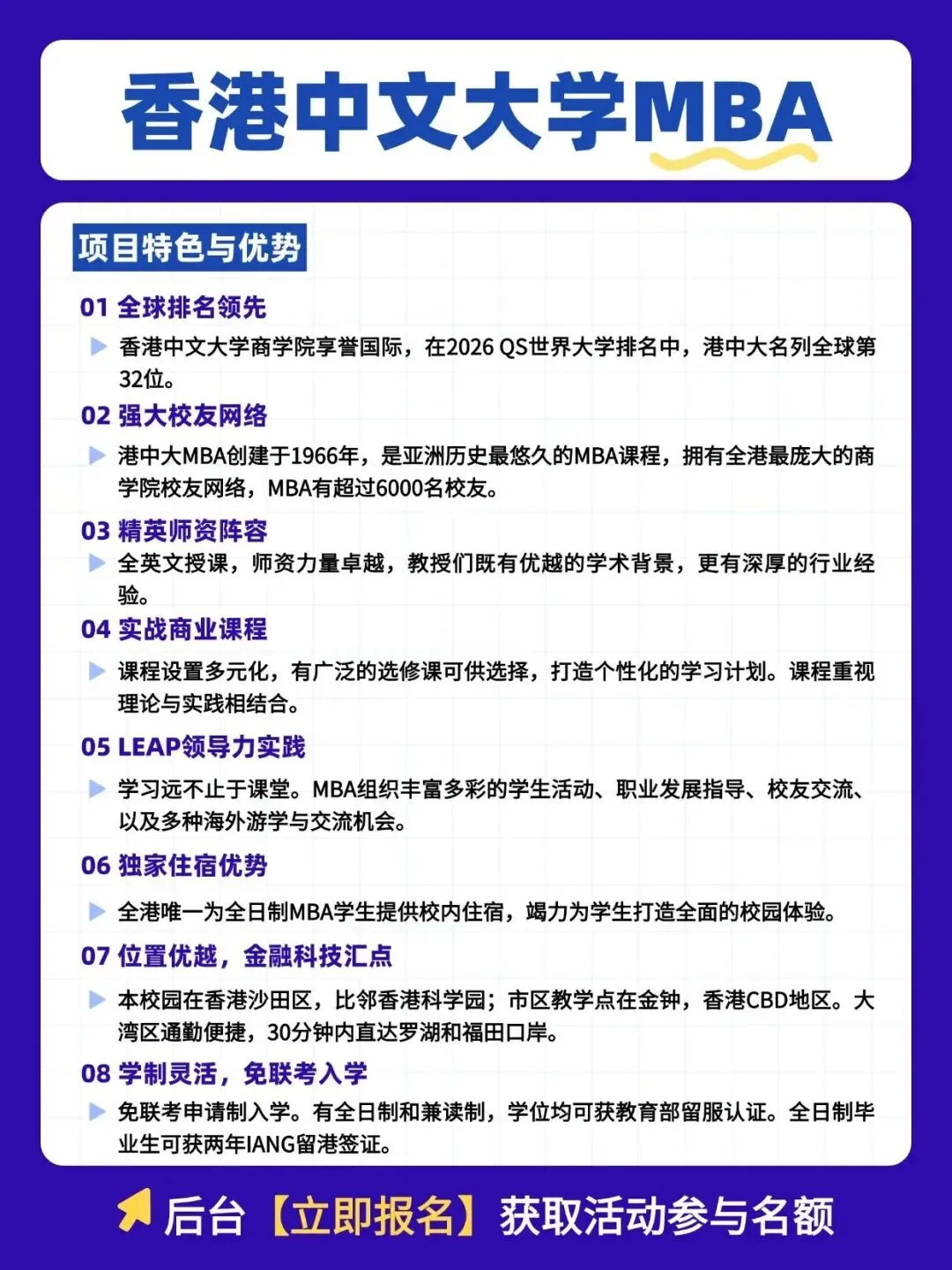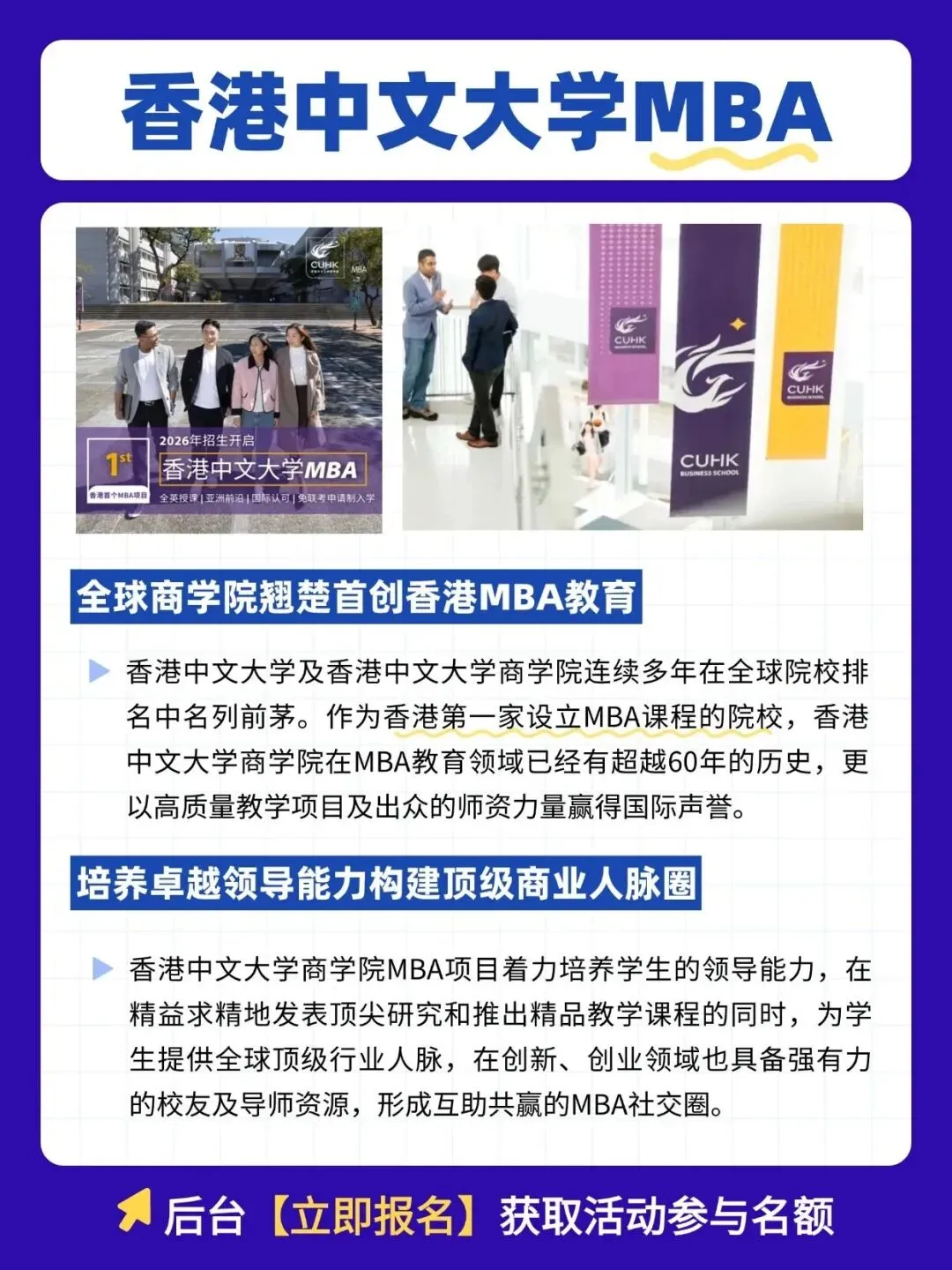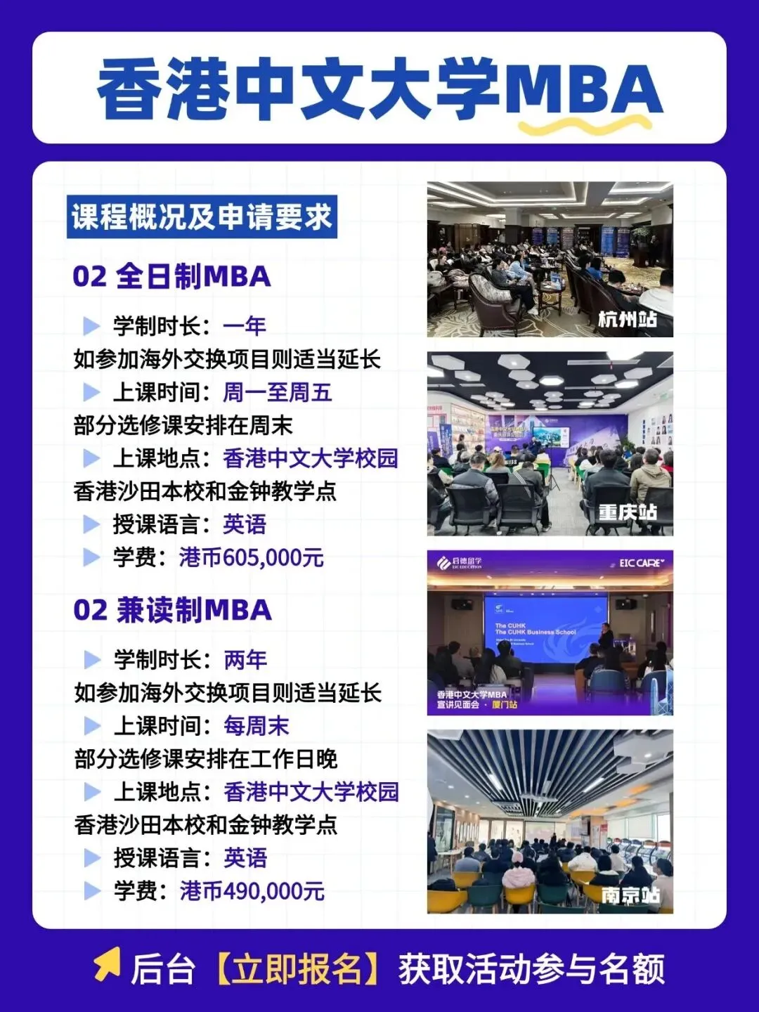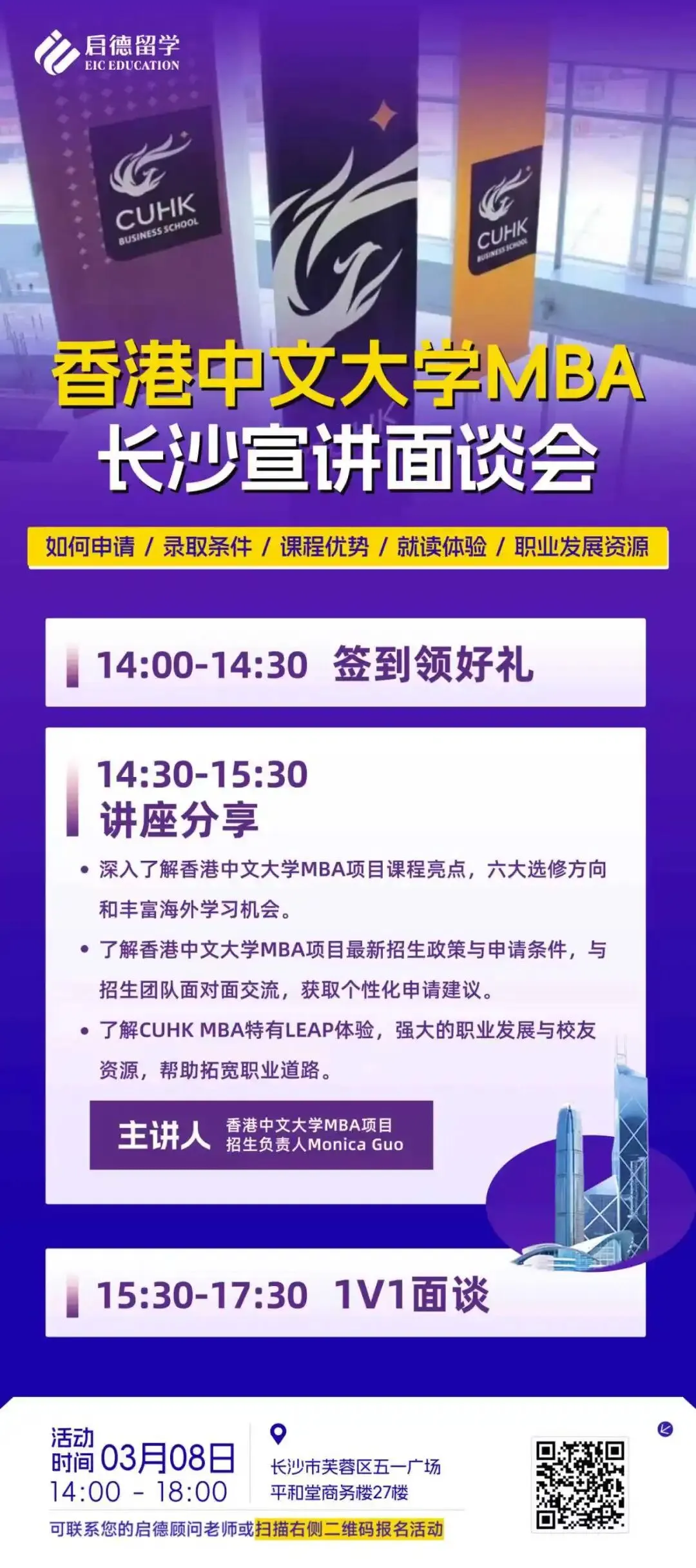 想冲刺亚洲顶尖MBA?想与招生官1V1定制申请方案?香港中文大学MBA武汉宣讲见面会来了!🔥3月8日,招生负责人亲临长沙,带你深度解析:✅ 六大选修方向与海外交换机会✅ 最新录取政策与申请条件✅ LEAP领导力实践与校友资源✅ 现场面谈,还能免MBA项目申请费!📅 时间:3月8日 14:00-18:00📍 地点:长沙市芙蓉区五一广场平和堂商务楼27楼