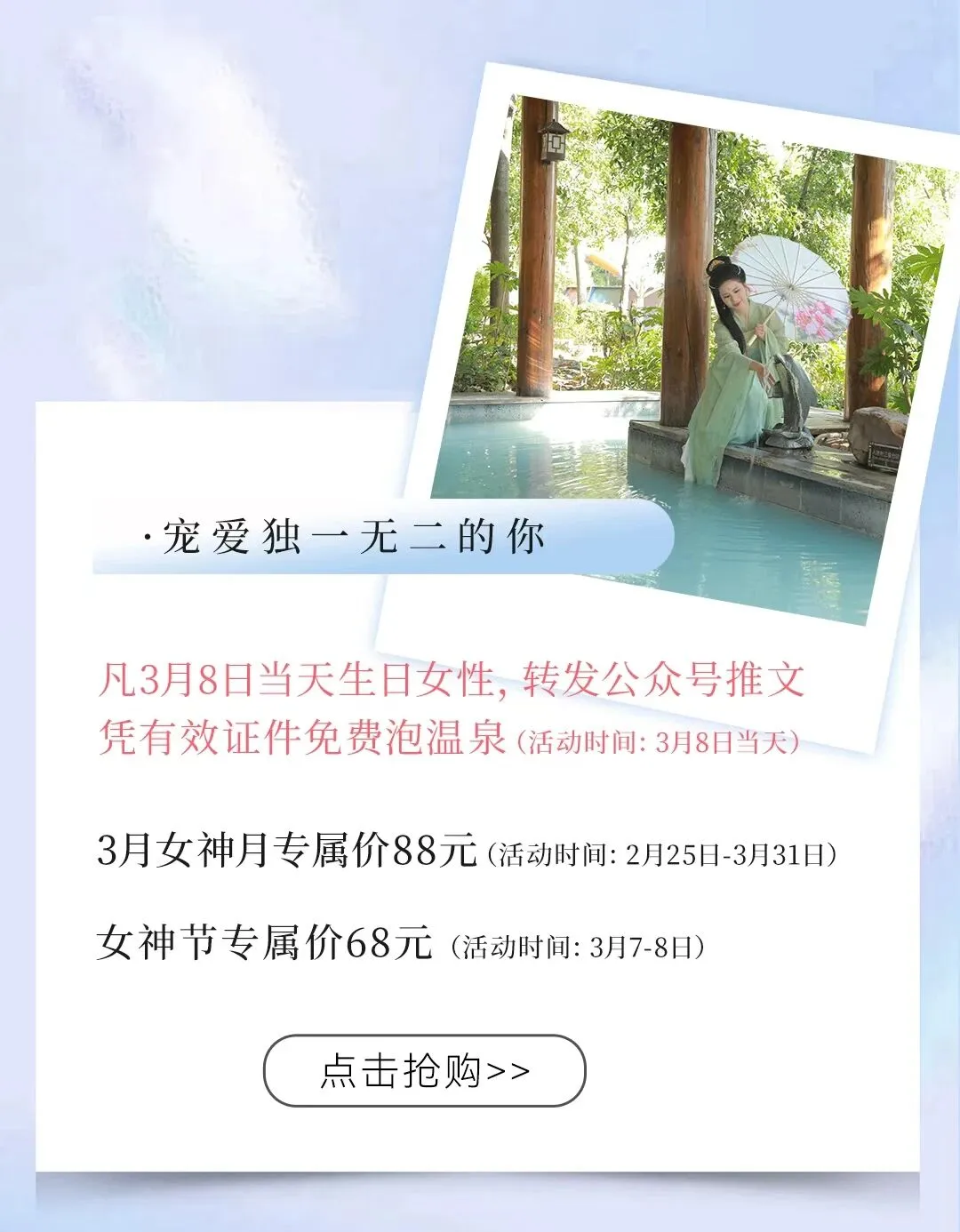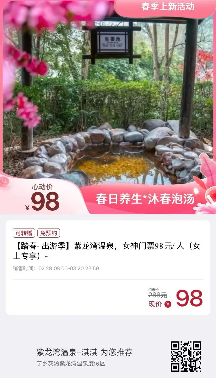 活动亮点:妇女节专属低价,让温暖汤泉洗去疲惫。