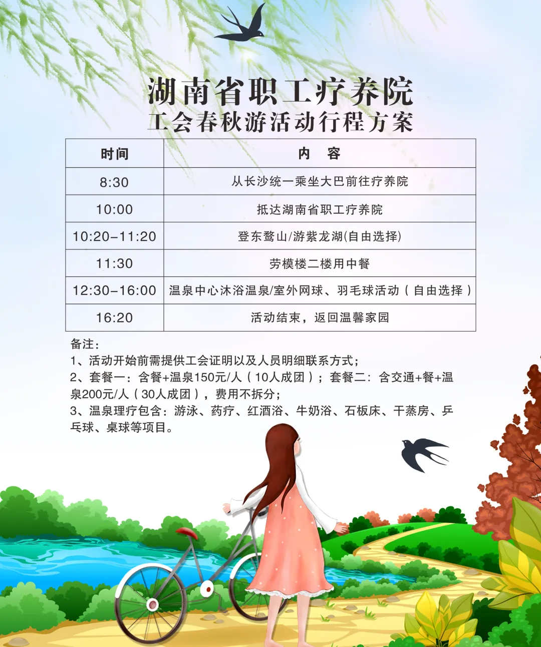 优惠活动:• 双人温泉套票199元(3月1日-10日购买,使用至4月30日)• 团队春游150元/人(含温泉+正餐)• 团队春游200元/人(含温泉+正餐+长沙市内往返接送)