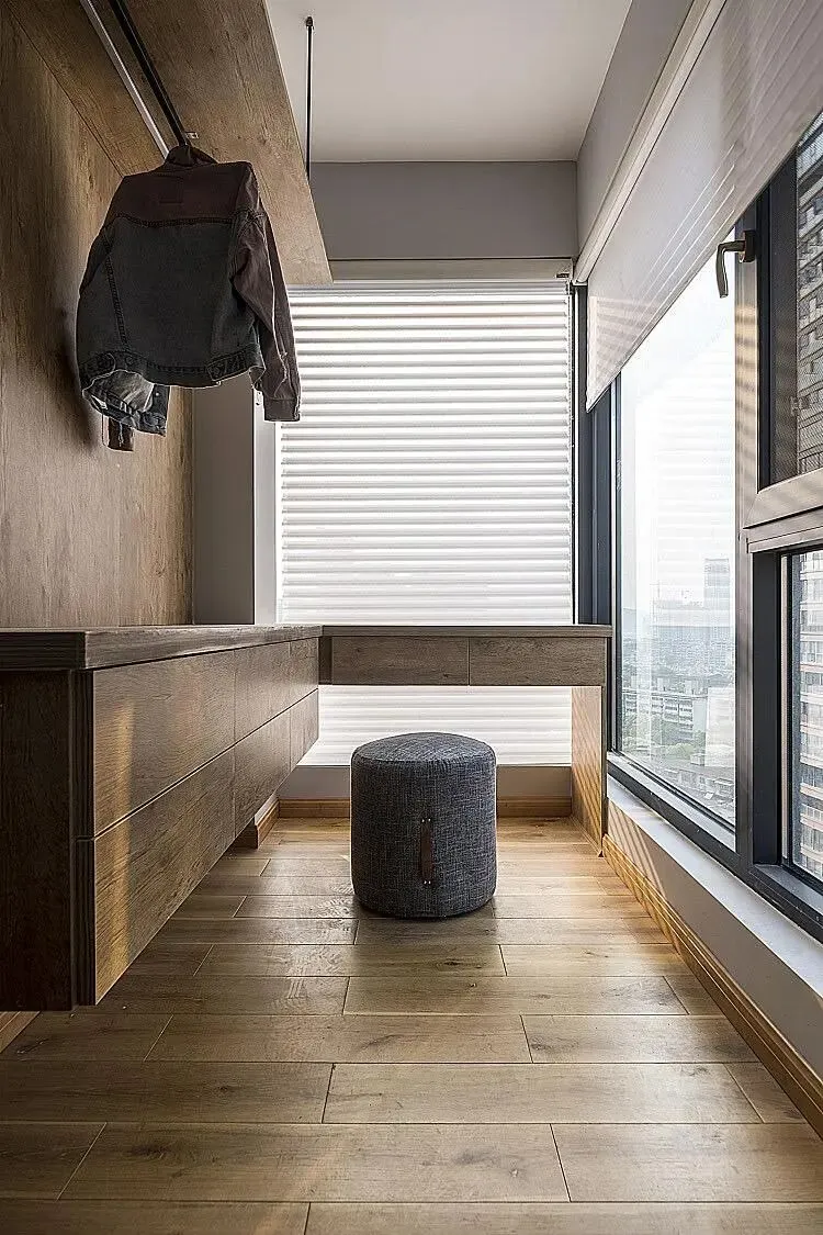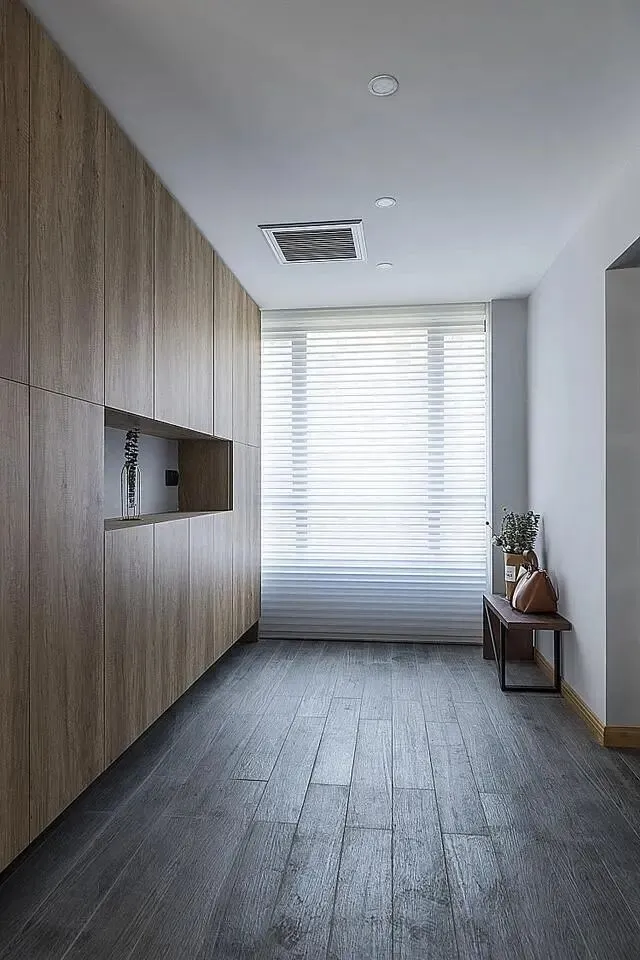 地面铺设深胡桃木色的“木纹瓷砖”,不会破坏整体自然格调,又能保证耐磨且好打理卫生。角落灵活摆放换鞋凳,干净整洁又实用。