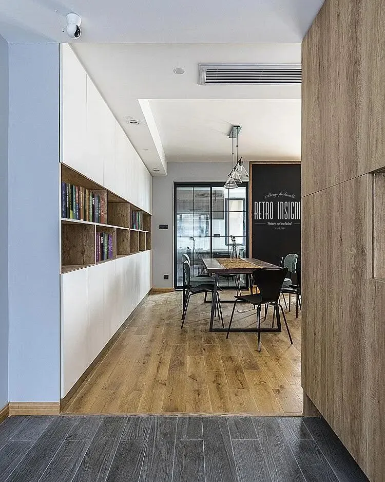 木色镂空区营造空间层次,收纳常用书籍、餐边常用小物,灵动且充满生活气息,餐厅随时可以变成图书吧。大人陪伴孩子阅读,其乐融融。