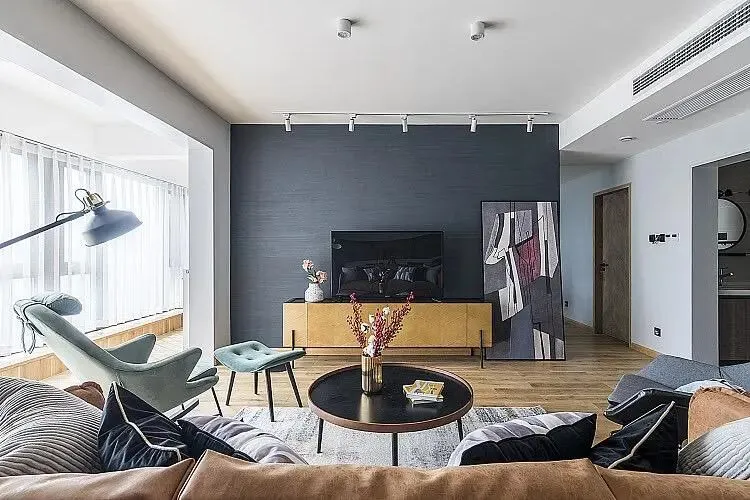 冷灰色和暖黄色实木电视柜呈鲜明的“冷暖对比”,辅以抽象画装饰,呈现一种低调不张扬的艺术气息。