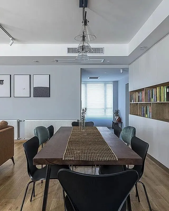 空间硬装浅色和中性色较多,餐桌椅相对选择了较深的深胡桃木色和墨绿色、黑色元素进行搭配,从空间上压得住整个色调。对比之下,也显得右边的浅色系储物墙更“隐形”。