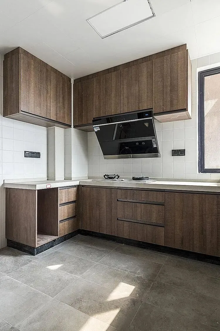 极简隐形拉手的复古橱柜门,搭配地面的复古做旧灰色瓷砖,打造一种非常温馨的年代感。