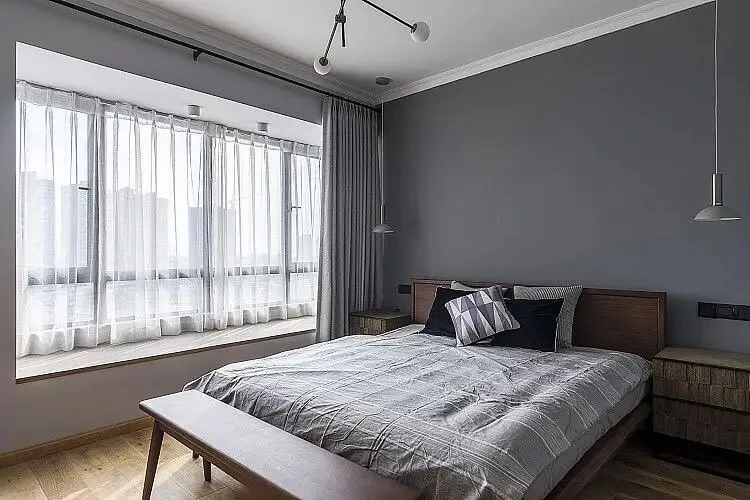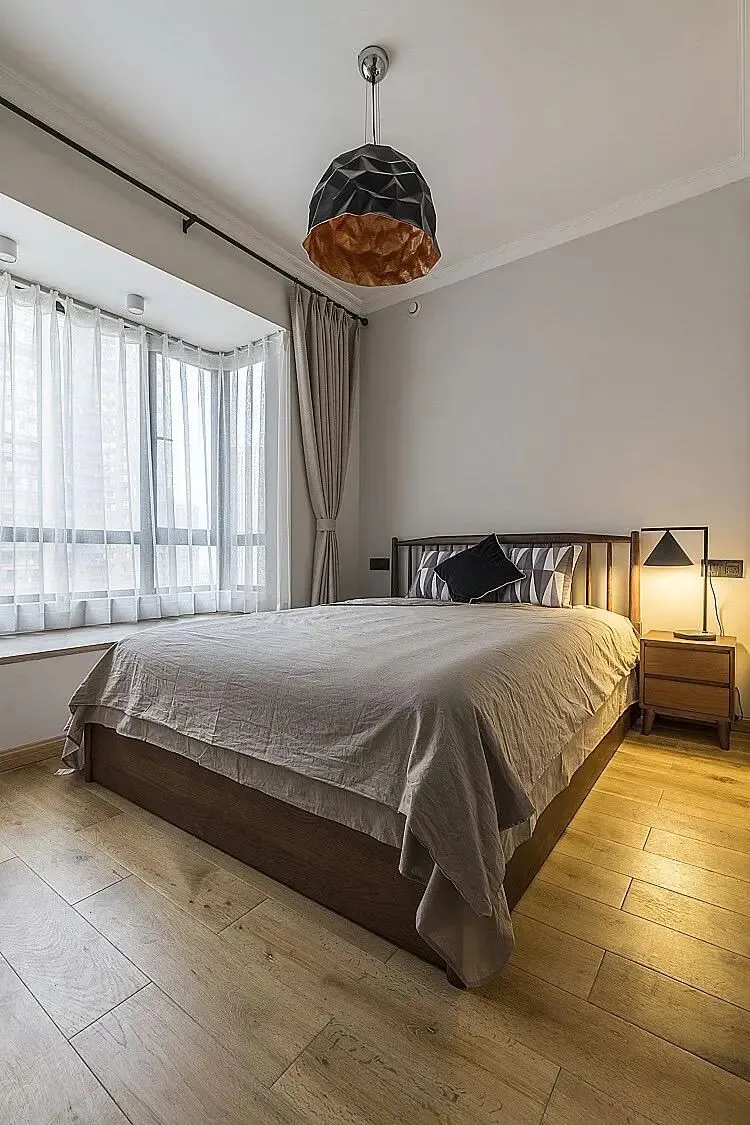 家具的配置是很有品质的,实木大床、拼接木纹造型床头柜,远看简约,细看都是精美格调,深灰色的床头背景墙,静谧解压。